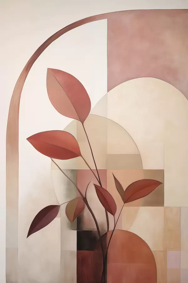 Poster Abstrakte Pflanze mit roten Blättern vor einem Hintergrund aus geometrischen Formen und sanften, gedämpften Farben Nr f47040