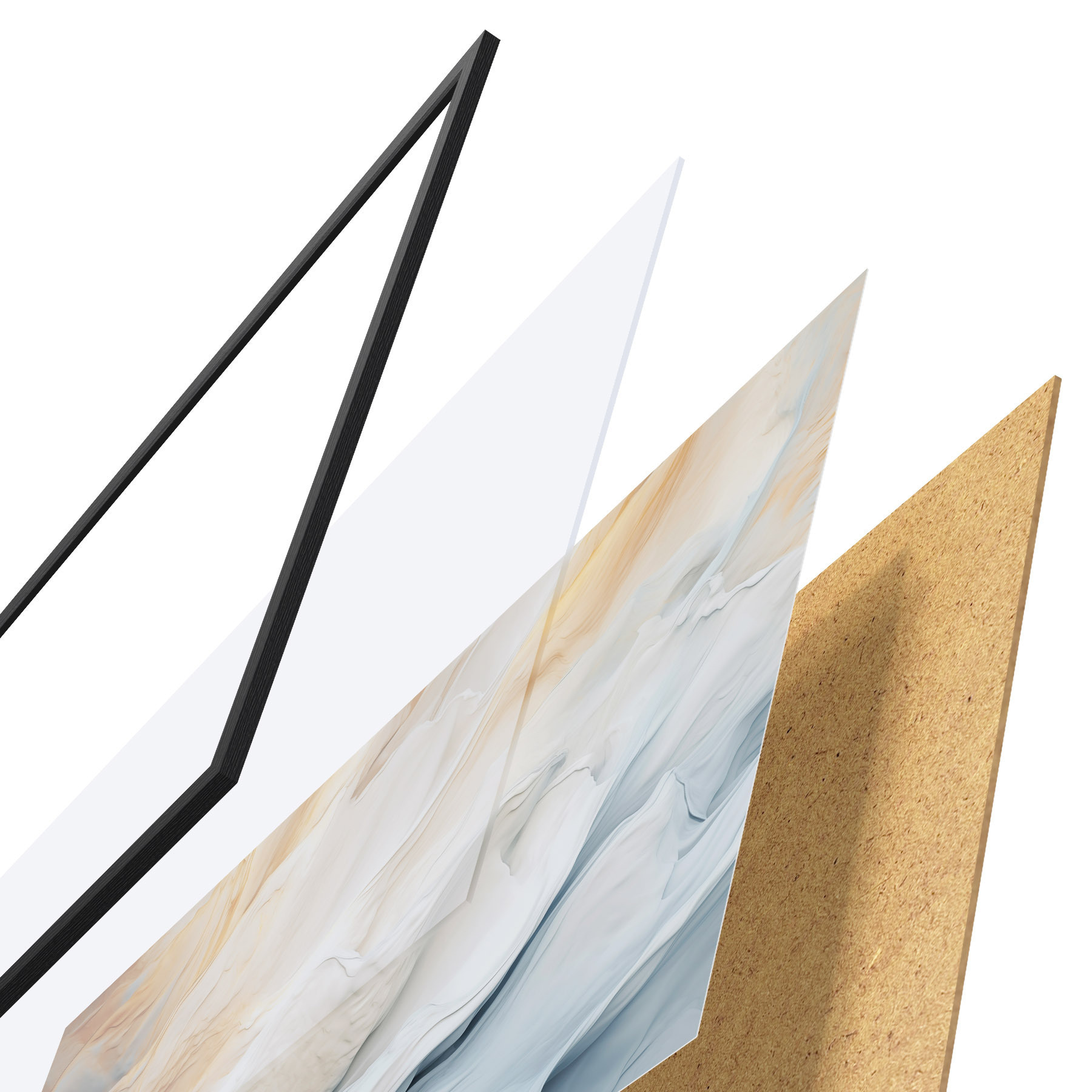 Das Poster besteht aus einem Rahmen, Plexiglas, einem gedruckten Bild und einer Rückwand aus Spanplatten. Dank der Halterungen auf der Rückseite kann das Poster sofort an die Wand gehängt werden.