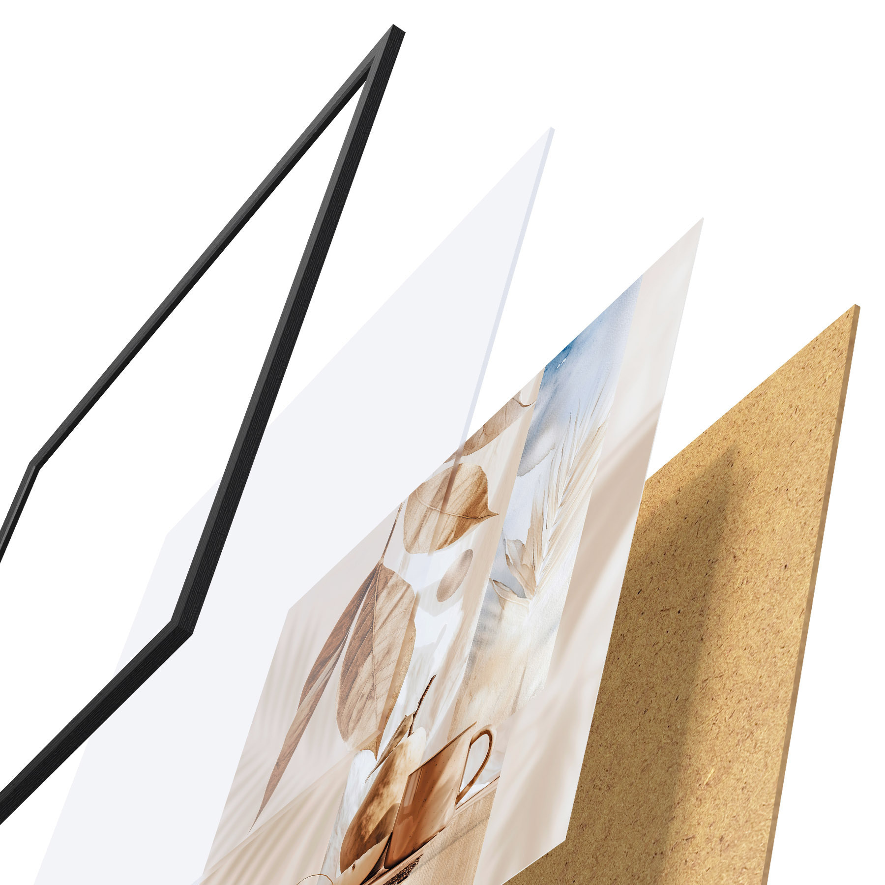Das Poster besteht aus einem Rahmen, Plexiglas, einem gedruckten Bild und einer Rückwand aus Spanplatten. Dank der Halterungen auf der Rückseite kann das Poster sofort an die Wand gehängt werden.