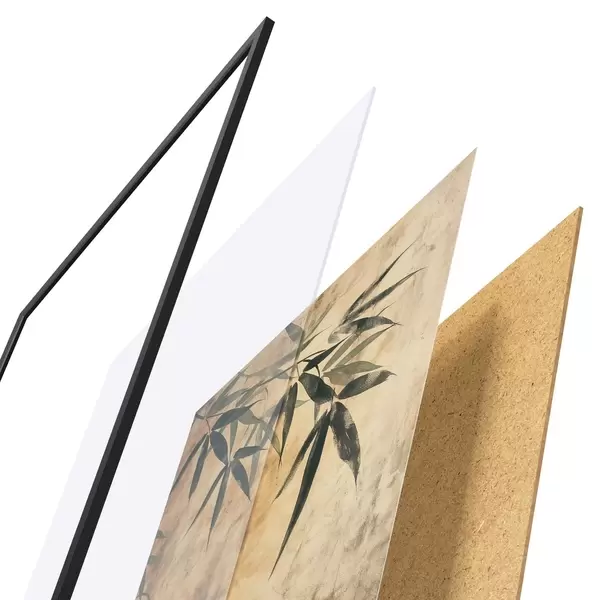 Das Poster besteht aus einem Rahmen, Plexiglas, einem gedruckten Bild und einer Rückwand aus Spanplatten. Dank der Halterungen auf der Rückseite kann das Poster sofort an die Wand gehängt werden.