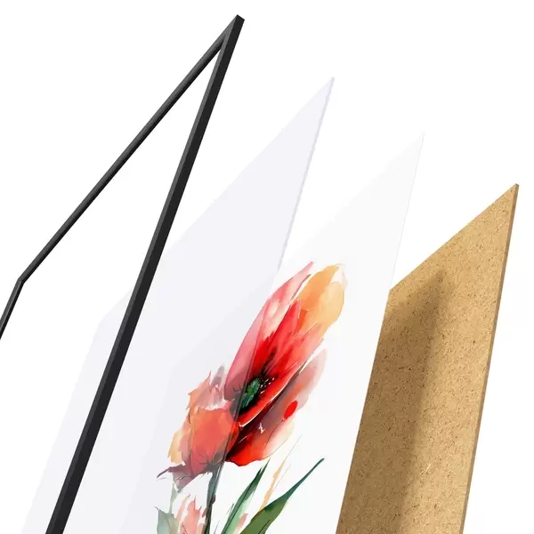Das Poster besteht aus einem Rahmen, Plexiglas, einem gedruckten Bild und einer Rückwand aus Spanplatten. Dank der Halterungen auf der Rückseite kann das Poster sofort an die Wand gehängt werden.