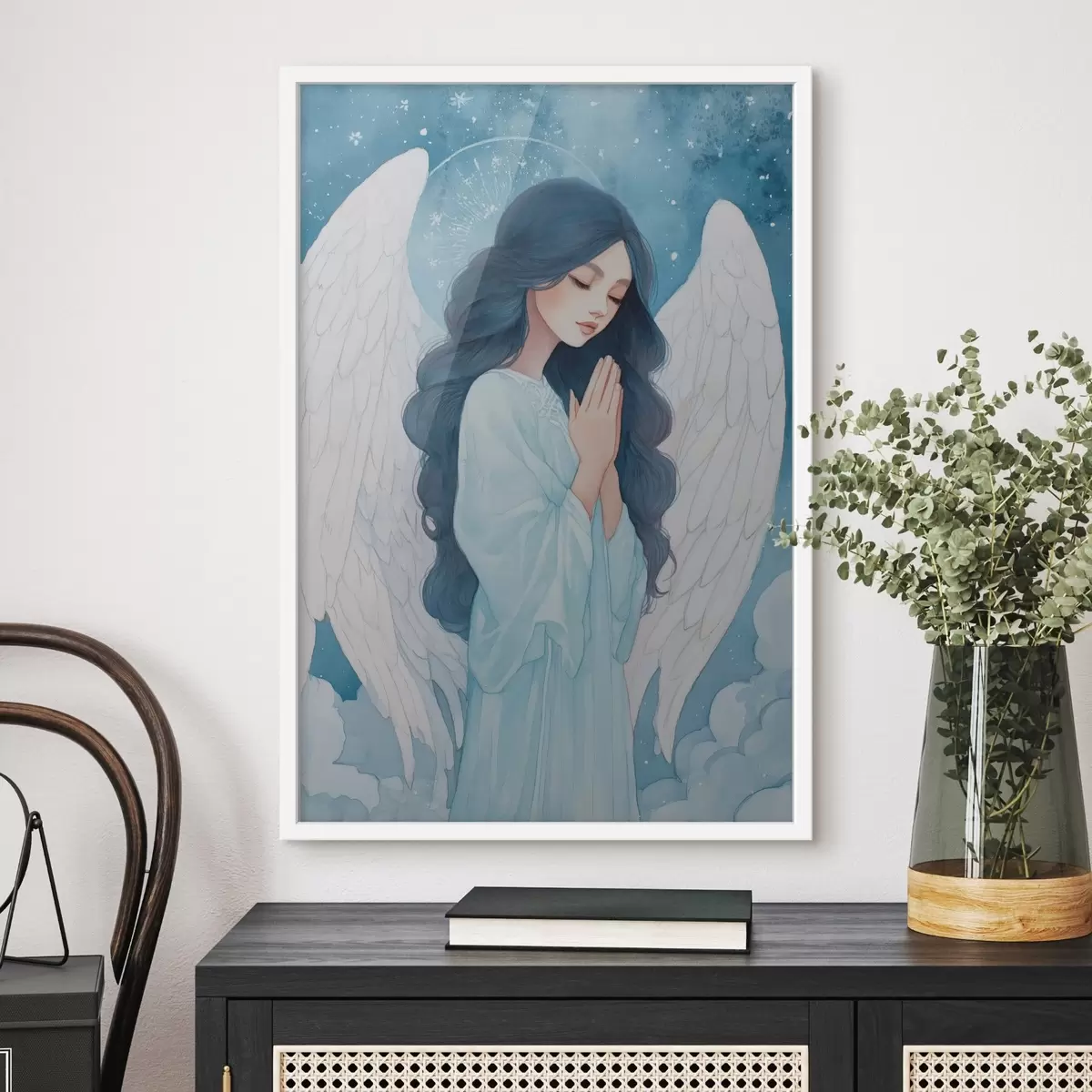 Poster Bezaubernde Illustration eines Engels zwischen Wolken in einer weiß-blauen Farbpalette f47095