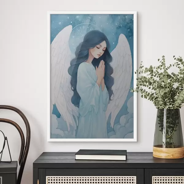Poster Bezaubernde Illustration eines Engels zwischen Wolken in einer weiß-blauen Farbpalette Nr f47095