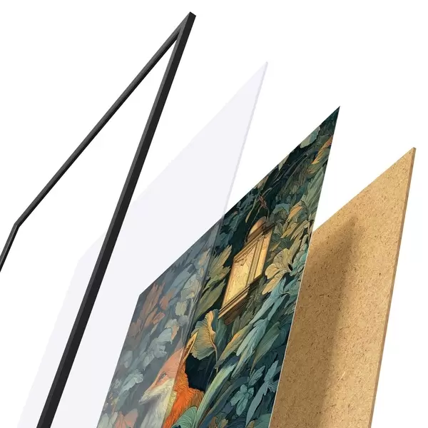 Das Poster besteht aus einem Rahmen, Plexiglas, einem gedruckten Bild und einer Rückwand aus Spanplatten. Dank der Halterungen auf der Rückseite kann das Poster sofort an die Wand gehängt werden.