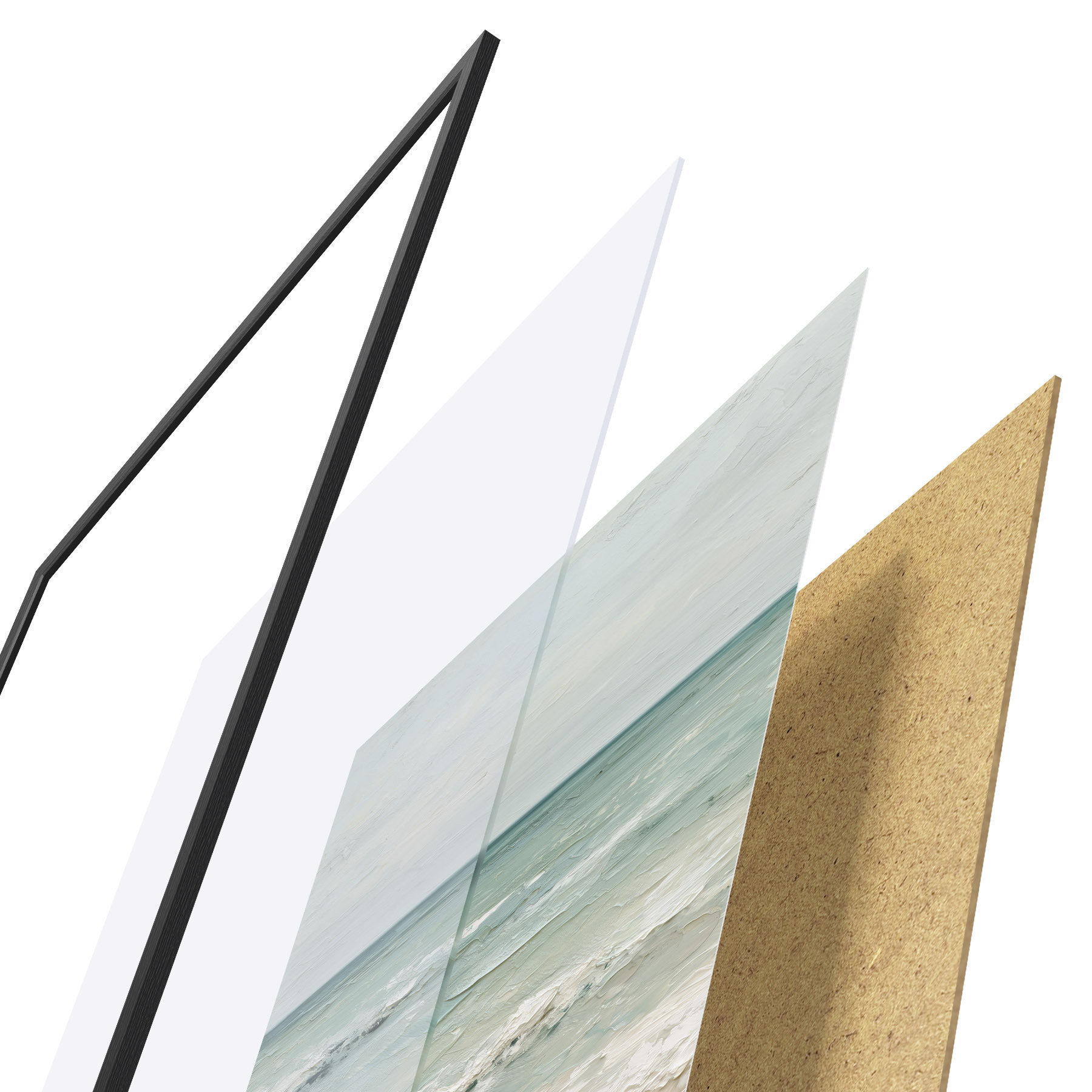 Das Poster besteht aus einem Rahmen, Plexiglas, einem gedruckten Bild und einer Rückwand aus Spanplatten. Dank der Halterungen auf der Rückseite kann das Poster sofort an die Wand gehängt werden.