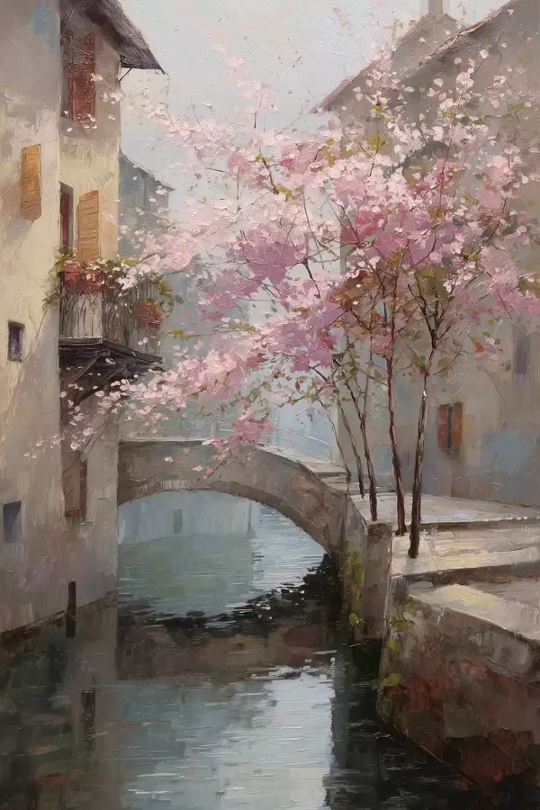 Poster Romantisches Stadtbild mit einem blühenden Baum im Stil eines Ölgemäldes Nr f47127