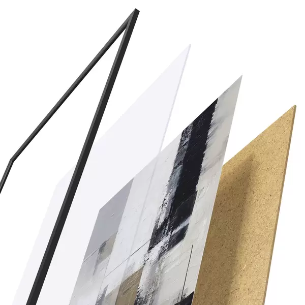 Das Poster besteht aus einem Rahmen, Plexiglas, einem gedruckten Bild und einer Rückwand aus Spanplatten. Dank der Halterungen auf der Rückseite kann das Poster sofort an die Wand gehängt werden.