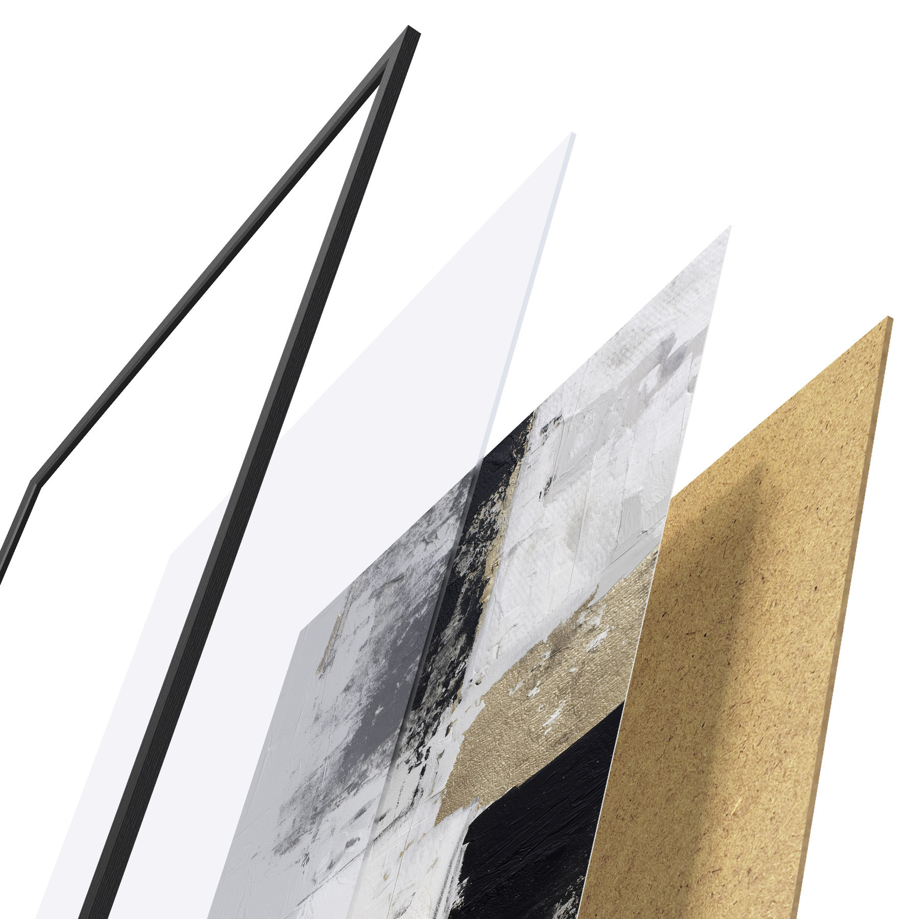 Das Poster besteht aus einem Rahmen, Plexiglas, einem gedruckten Bild und einer Rückwand aus Spanplatten. Dank der Halterungen auf der Rückseite kann das Poster sofort an die Wand gehängt werden.