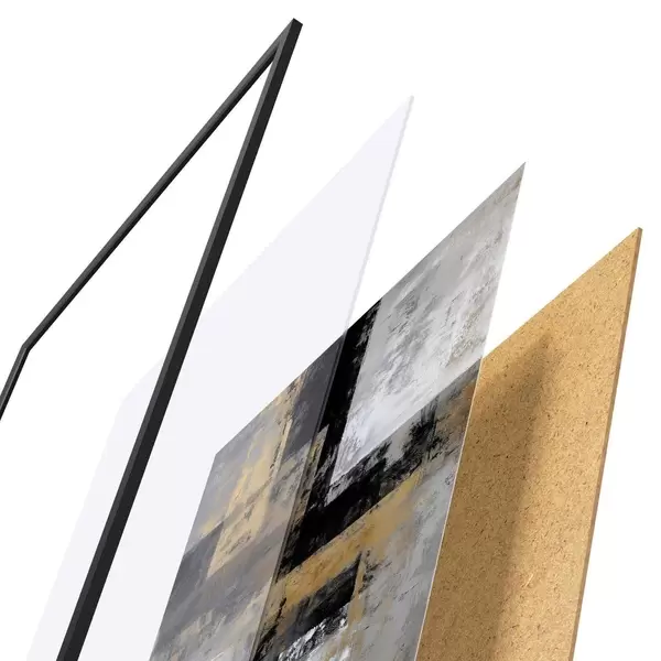 Das Poster besteht aus einem Rahmen, Plexiglas, einem gedruckten Bild und einer Rückwand aus Spanplatten. Dank der Halterungen auf der Rückseite kann das Poster sofort an die Wand gehängt werden.