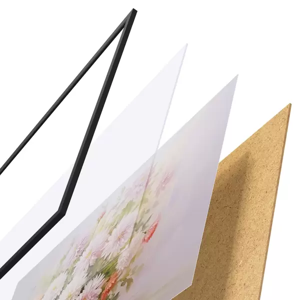 Das Poster besteht aus einem Rahmen, Plexiglas, einem gedruckten Bild und einer Rückwand aus Spanplatten. Dank der Halterungen auf der Rückseite kann das Poster sofort an die Wand gehängt werden.