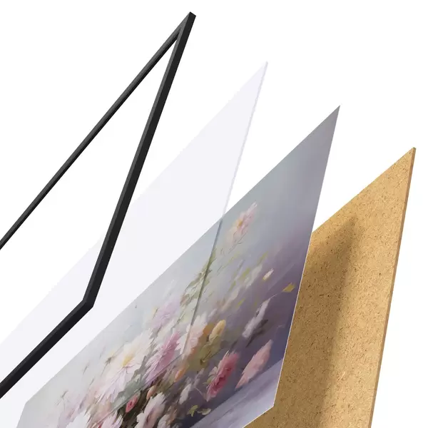 Das Poster besteht aus einem Rahmen, Plexiglas, einem gedruckten Bild und einer Rückwand aus Spanplatten. Dank der Halterungen auf der Rückseite kann das Poster sofort an die Wand gehängt werden.