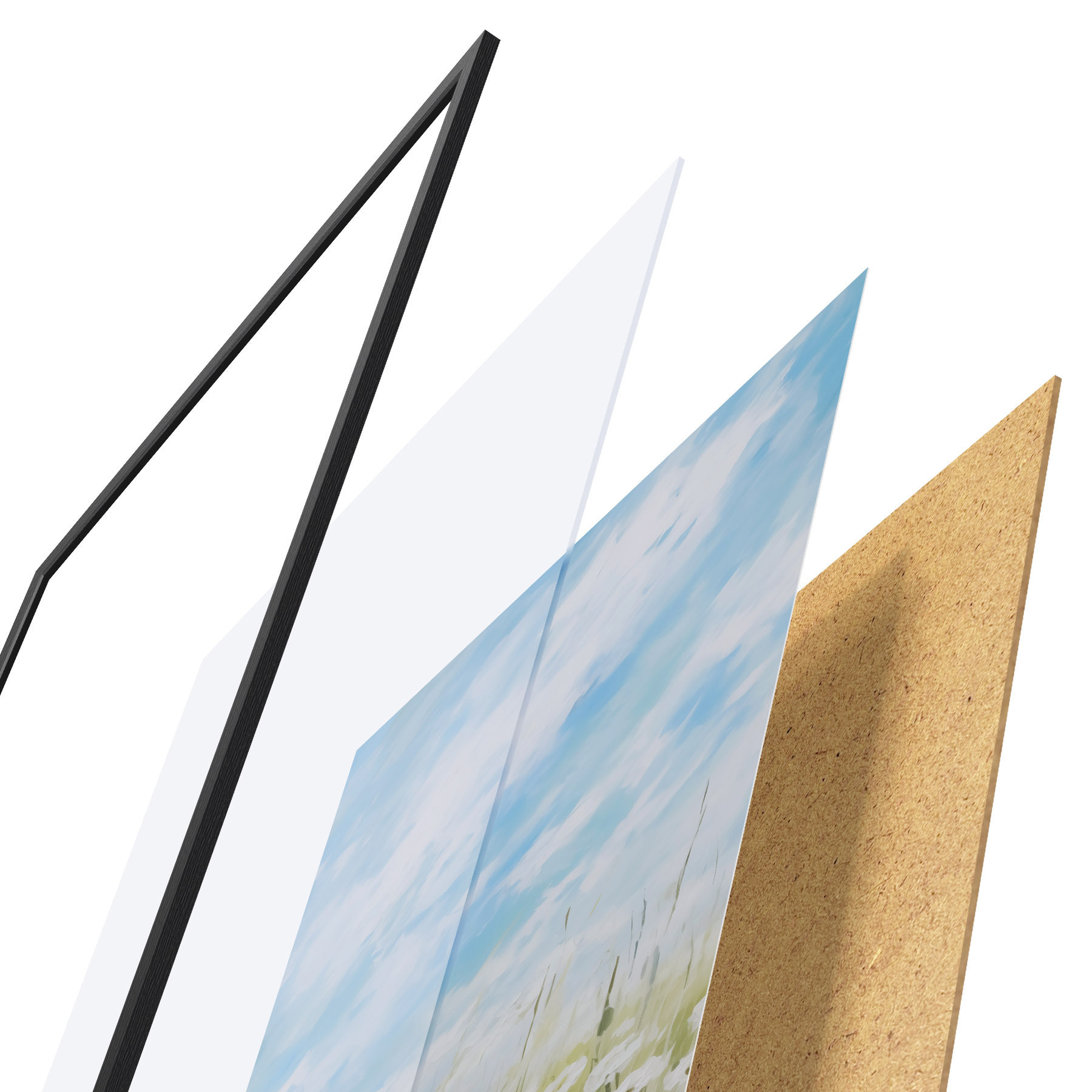 Das Poster besteht aus einem Rahmen, Plexiglas, einem gedruckten Bild und einer Rückwand aus Spanplatten. Dank der Halterungen auf der Rückseite kann das Poster sofort an die Wand gehängt werden.