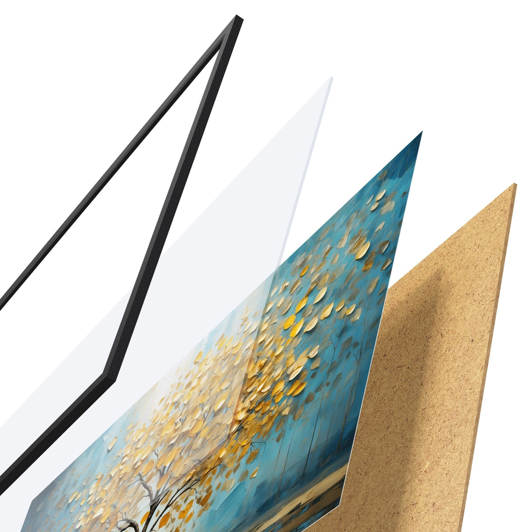 Das Poster besteht aus einem Rahmen, Plexiglas, einem gedruckten Bild und einer Rückwand aus Spanplatten. Dank der Halterungen auf der Rückseite kann das Poster sofort an die Wand gehängt werden.