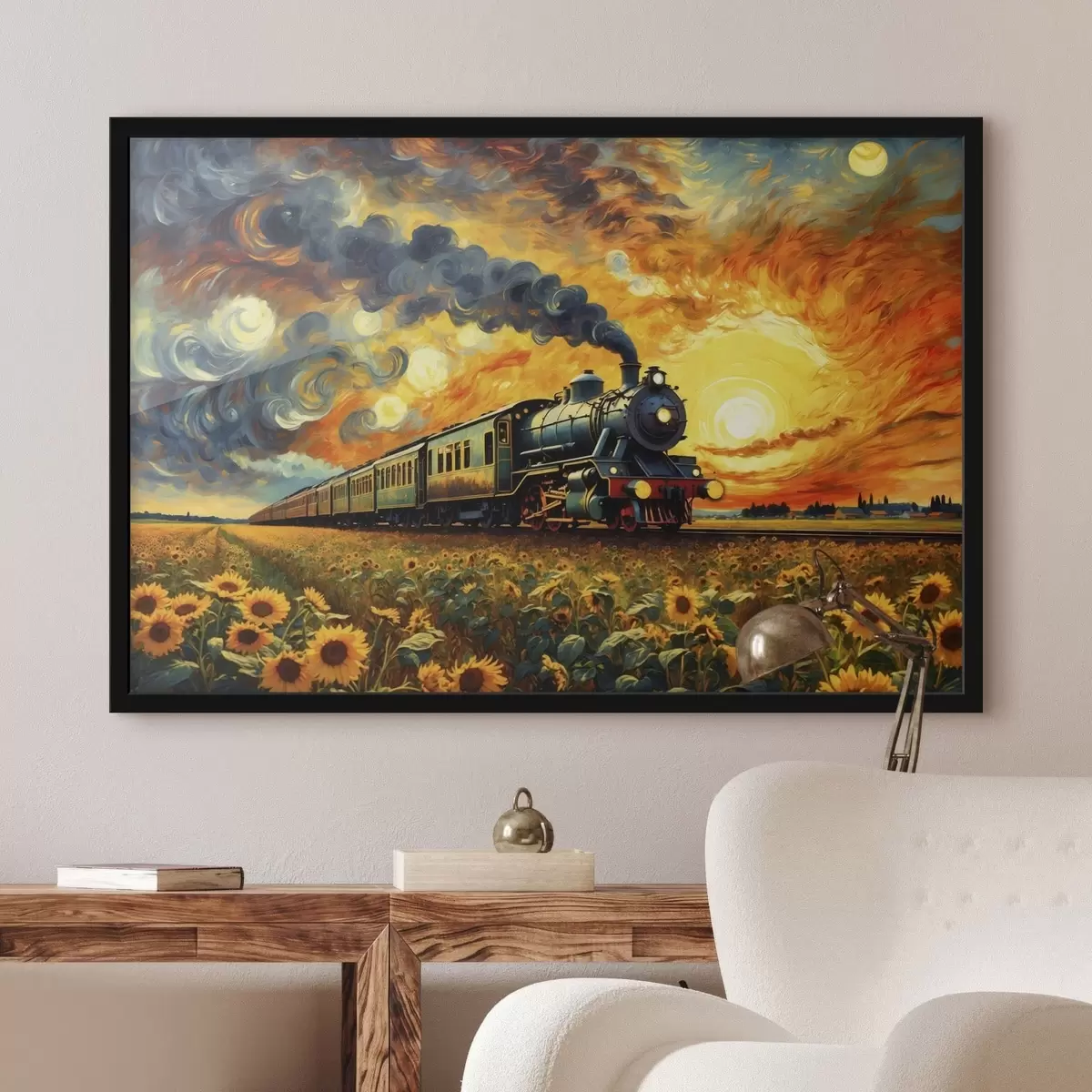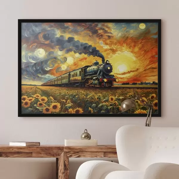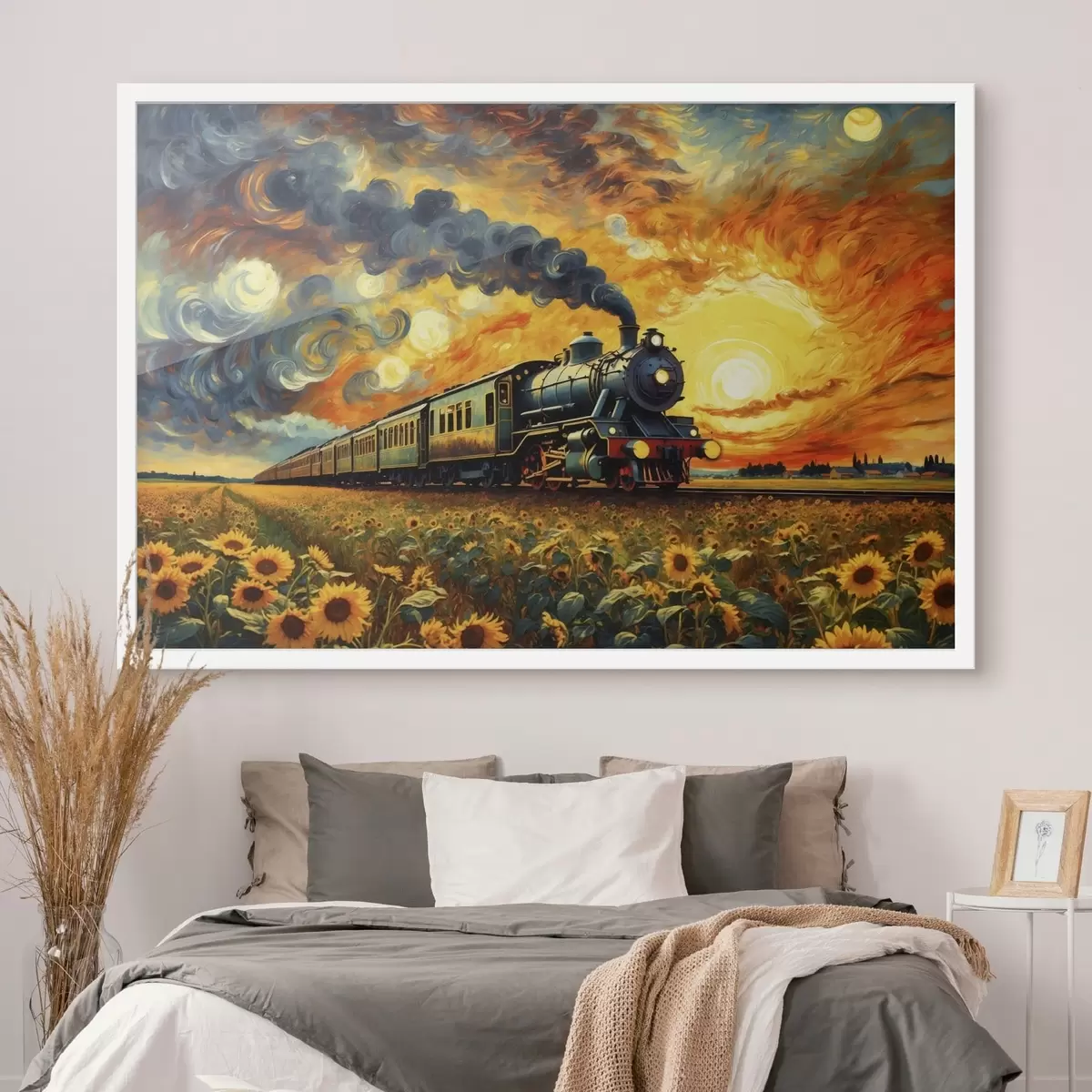Poster Dampflokomotive auf einem Feld mit dramatischem Himmel Nr f47257
