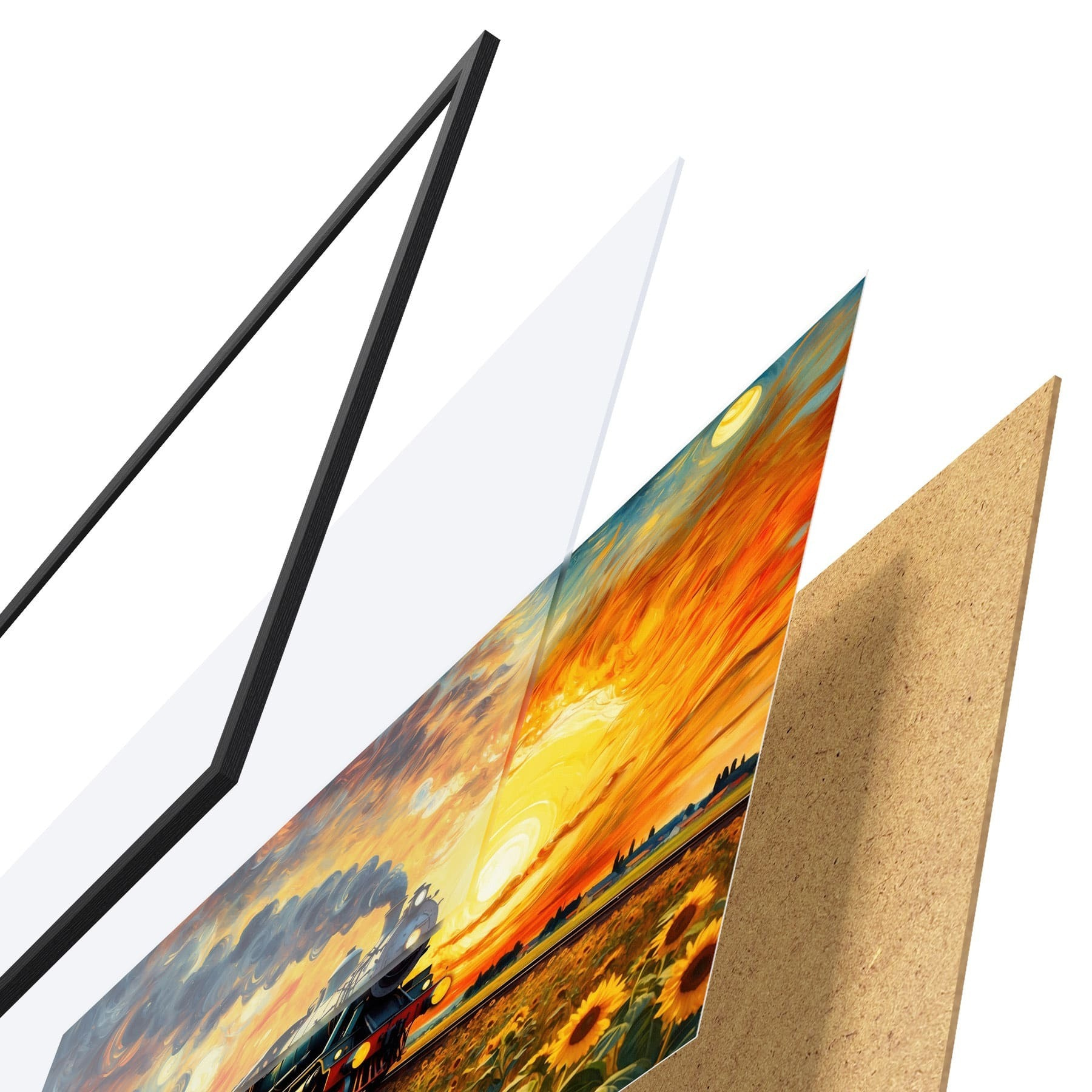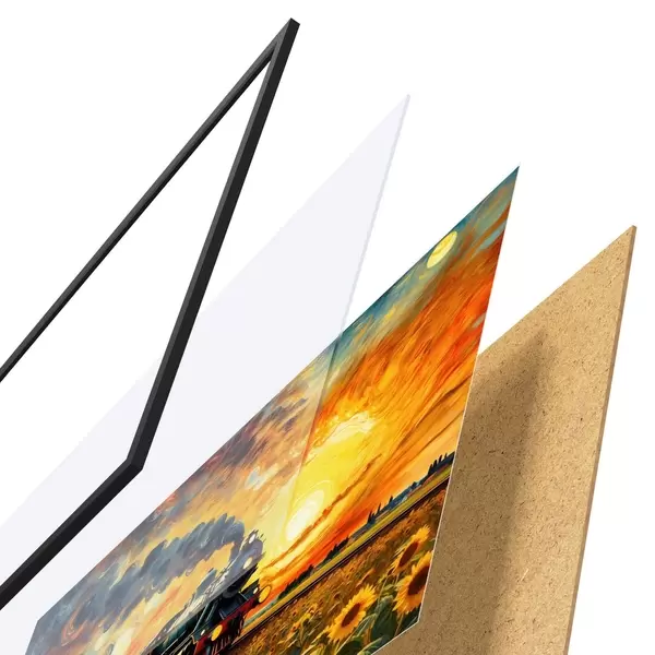 Das Poster besteht aus einem Rahmen, Plexiglas, einem gedruckten Bild und einer Rückwand aus Spanplatten. Dank der Halterungen auf der Rückseite kann das Poster sofort an die Wand gehängt werden.