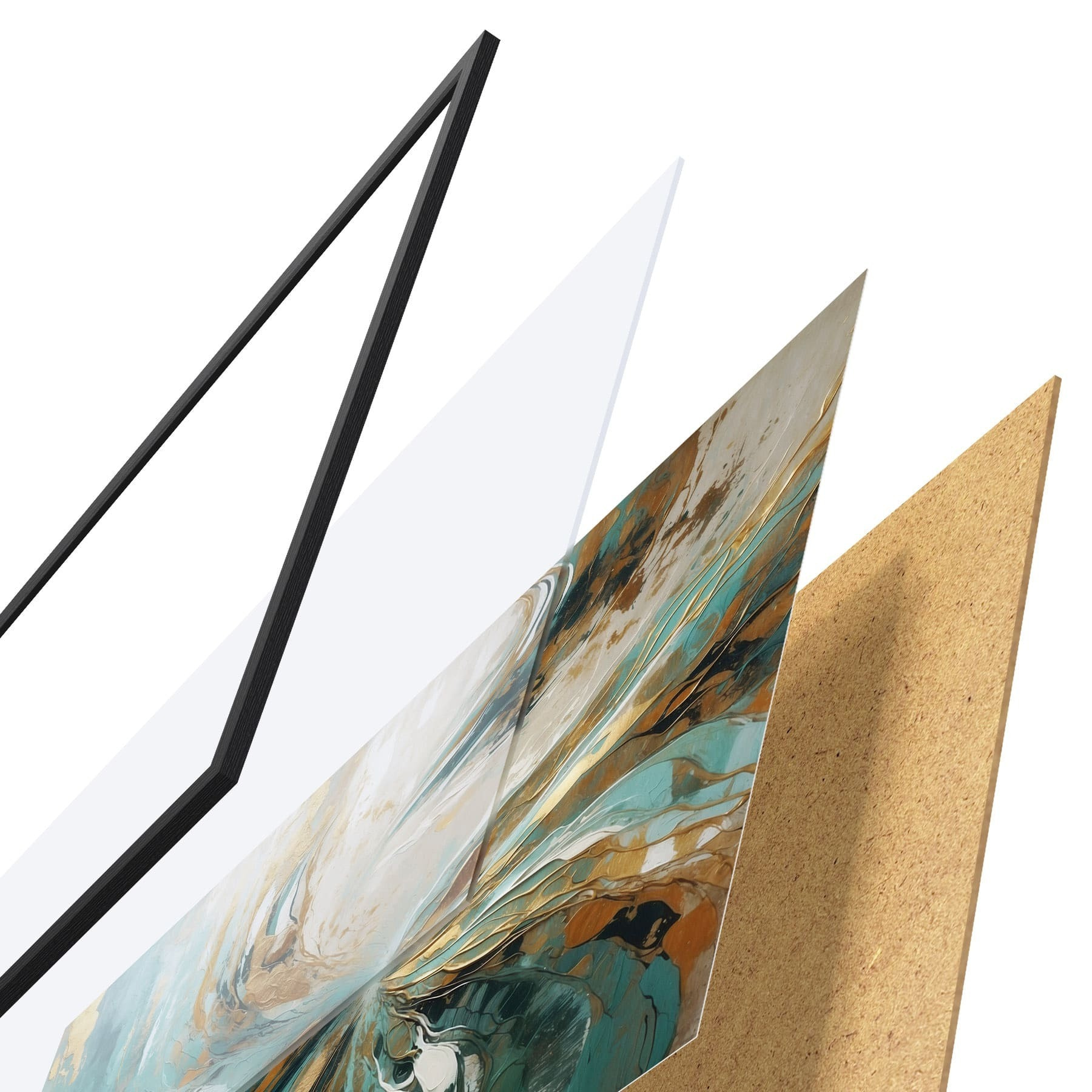 Das Poster besteht aus einem Rahmen, Plexiglas, einem gedruckten Bild und einer Rückwand aus Spanplatten. Dank der Halterungen auf der Rückseite kann das Poster sofort an die Wand gehängt werden.