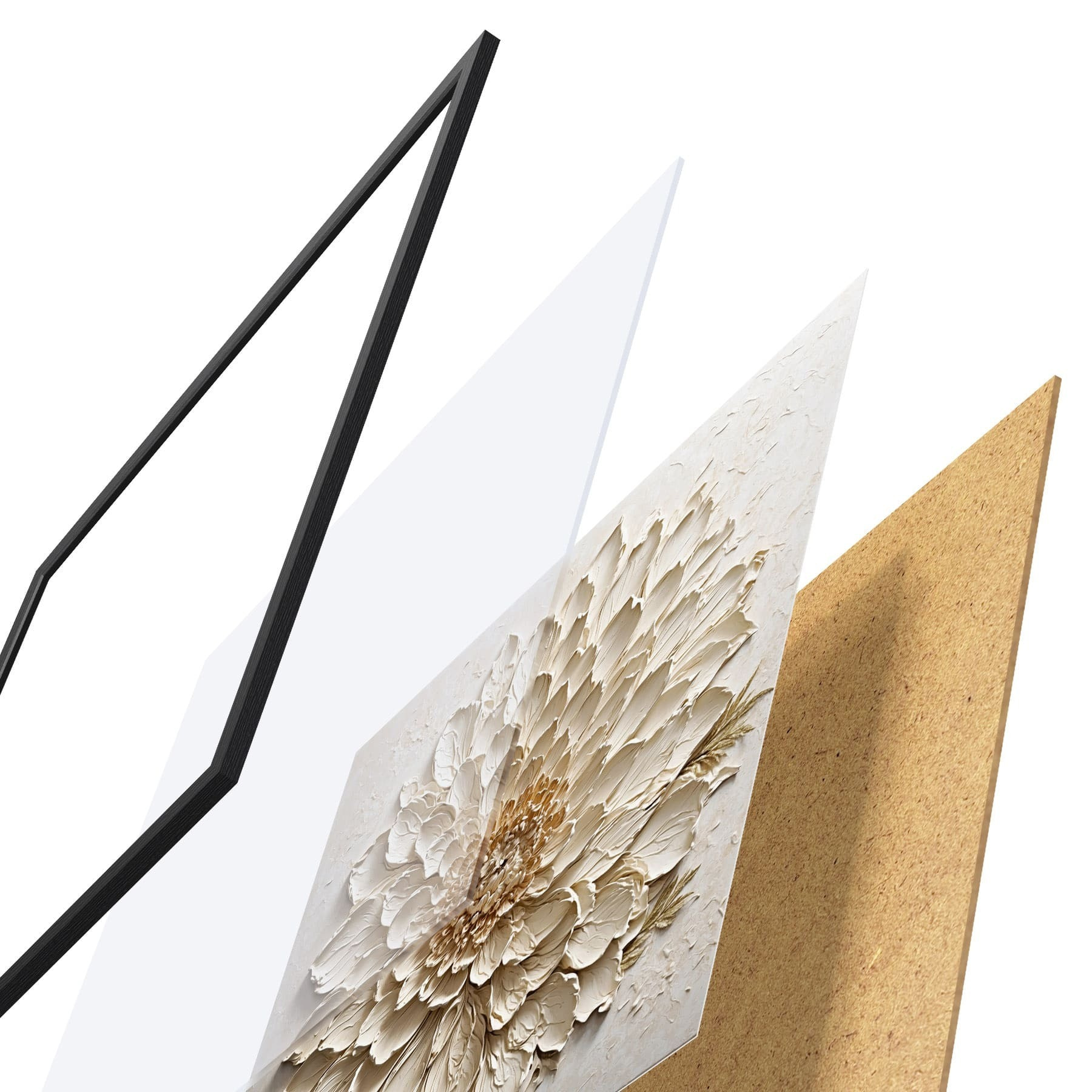 Das Poster besteht aus einem Rahmen, Plexiglas, einem gedruckten Bild und einer Rückwand aus Spanplatten. Dank der Halterungen auf der Rückseite kann das Poster sofort an die Wand gehängt werden.