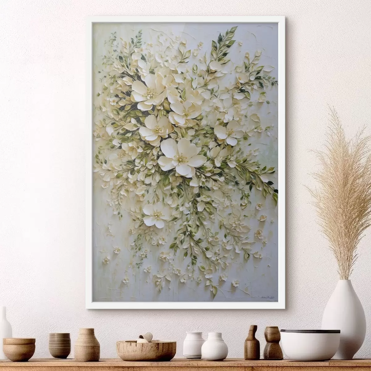 Poster Große Komposition aus cremefarbenen Blumen und Blättern Nr f47267