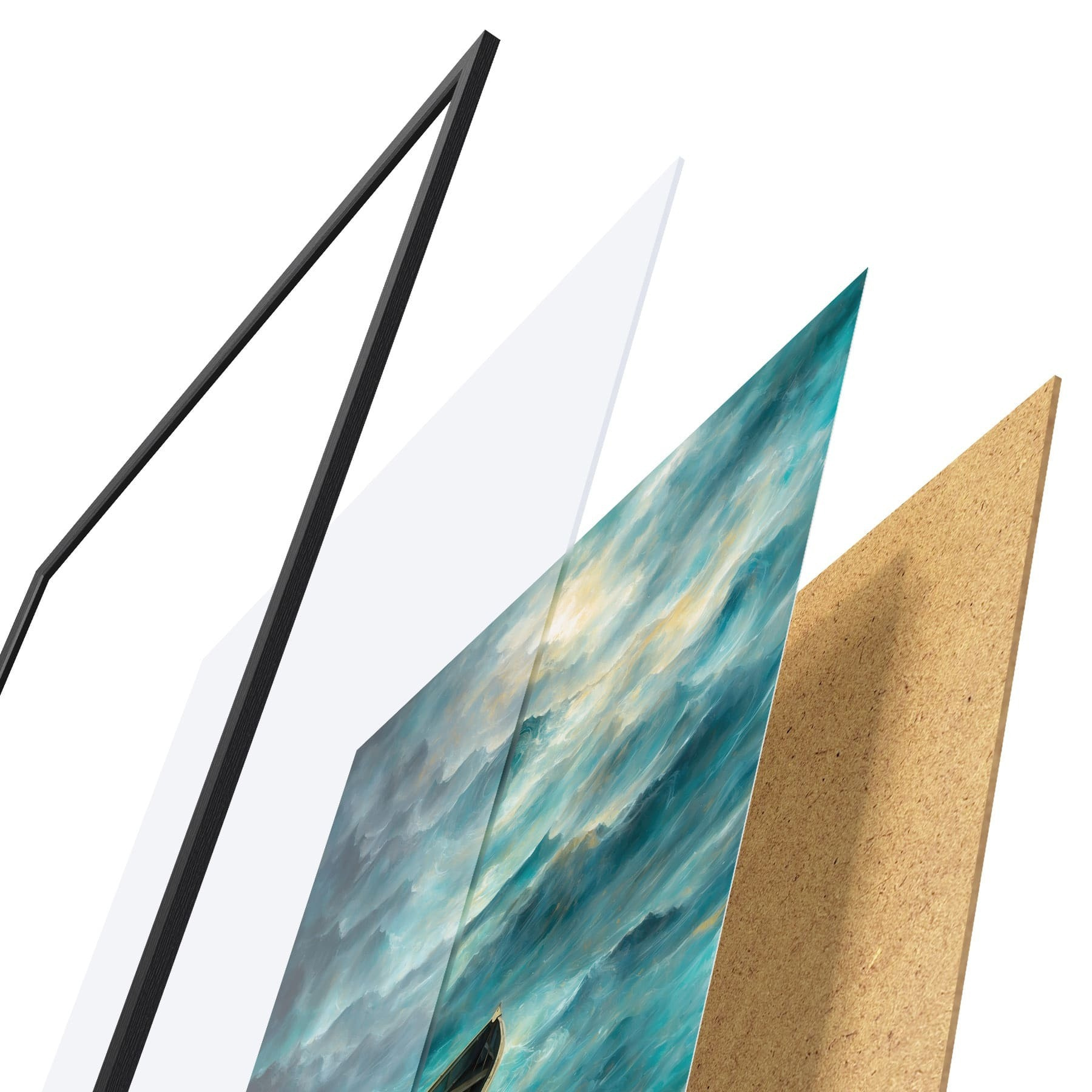 Das Poster besteht aus einem Rahmen, Plexiglas, einem gedruckten Bild und einer Rückwand aus Spanplatten. Dank der Halterungen auf der Rückseite kann das Poster sofort an die Wand gehängt werden.