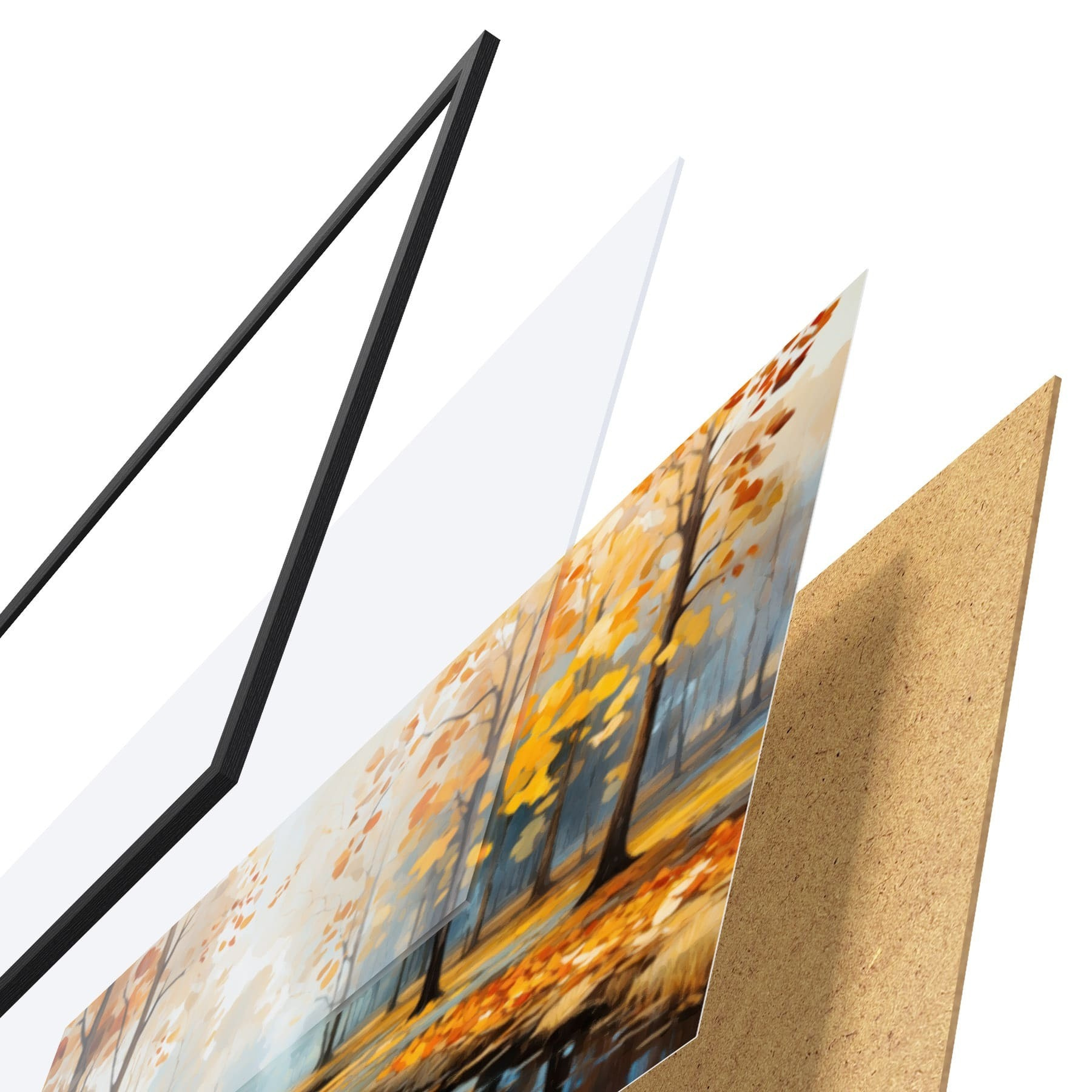 Das Poster besteht aus einem Rahmen, Plexiglas, einem gedruckten Bild und einer Rückwand aus Spanplatten. Dank der Halterungen auf der Rückseite kann das Poster sofort an die Wand gehängt werden.