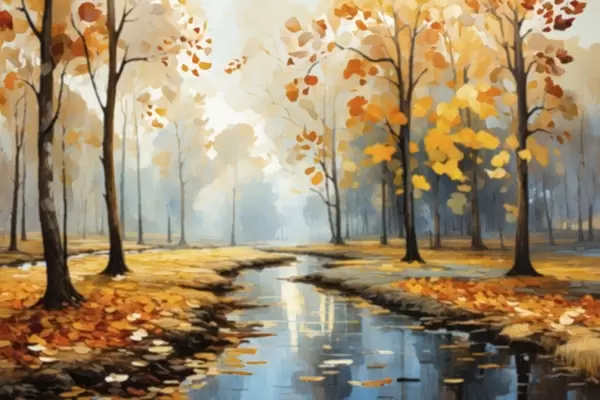 Poster Herbstwald mit Bach und gelben Blättern Nr f47278