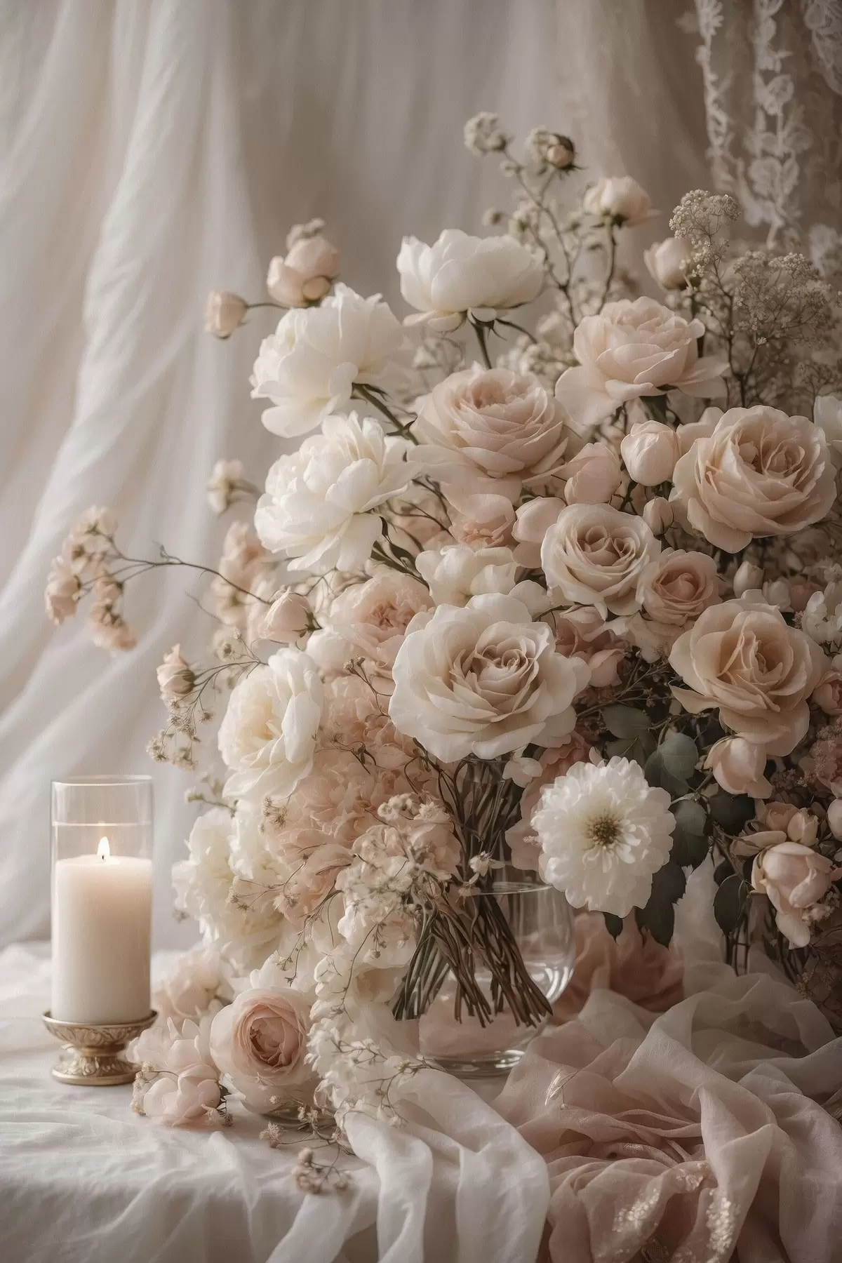 Poster Cremefarbene Blumen neben einer brennenden Kerze Nr f47281