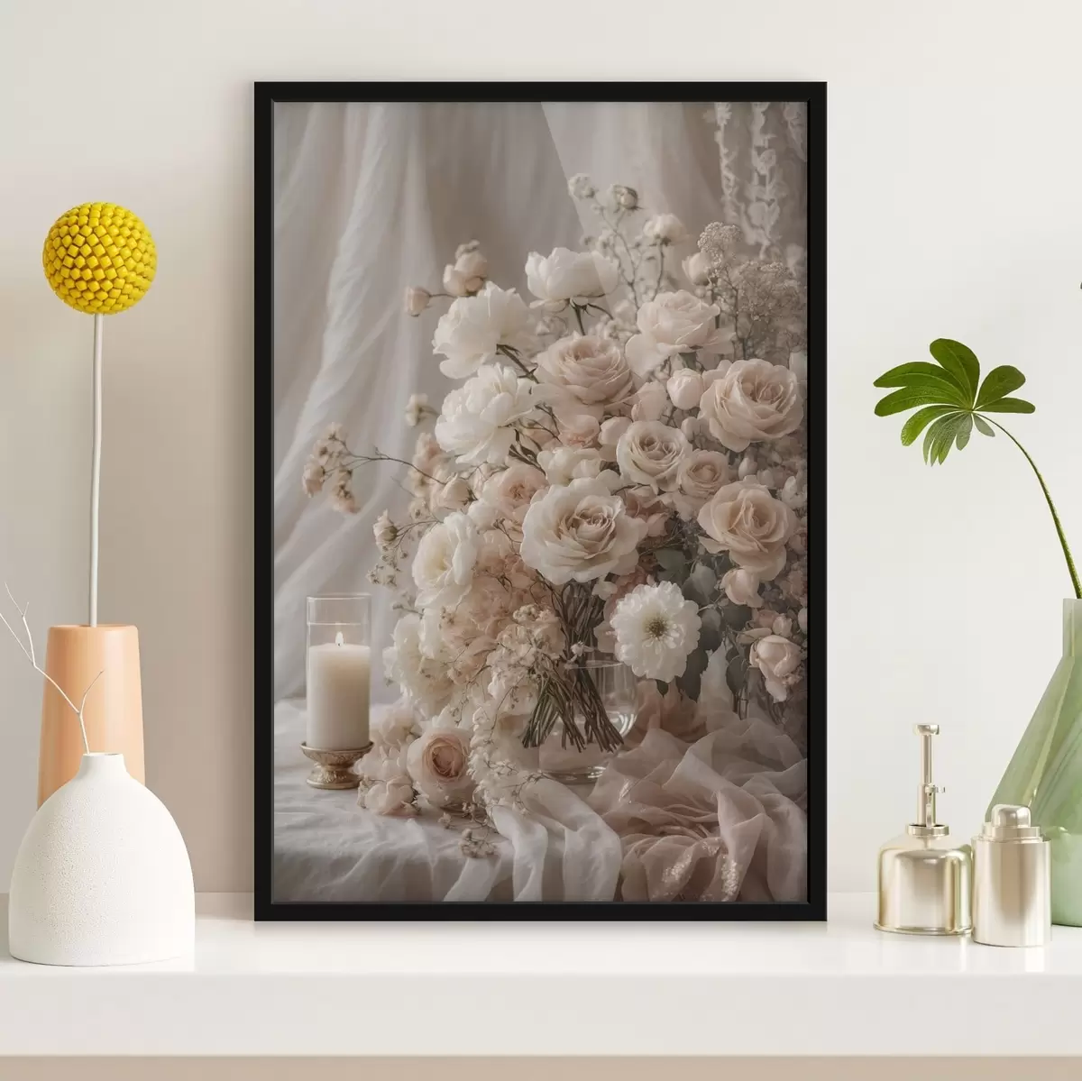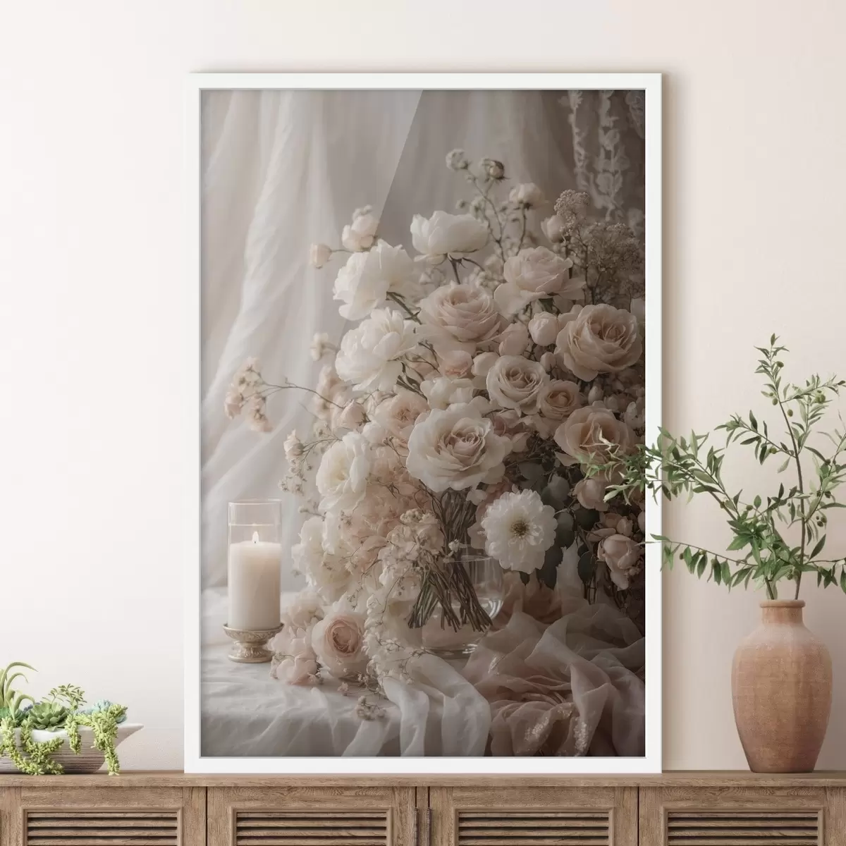 Poster Cremefarbene Blumen neben einer brennenden Kerze f47281
