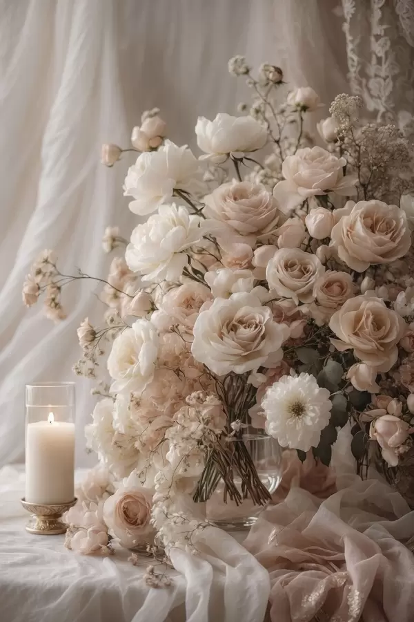 Poster Cremefarbene Blumen neben einer brennenden Kerze f47281