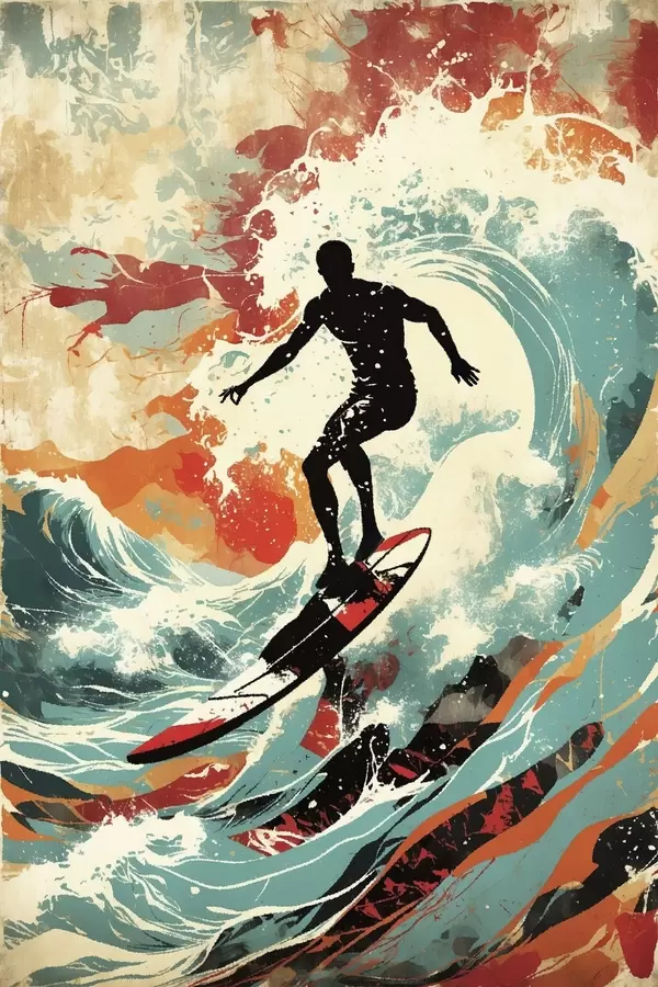 Poster Surfer-Silhouette auf Wellen in leuchtenden Farben Nr f47284