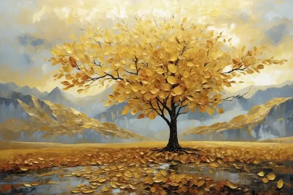 Poster Baum mit gelben Blättern in einer Berglandschaft Nr f47285