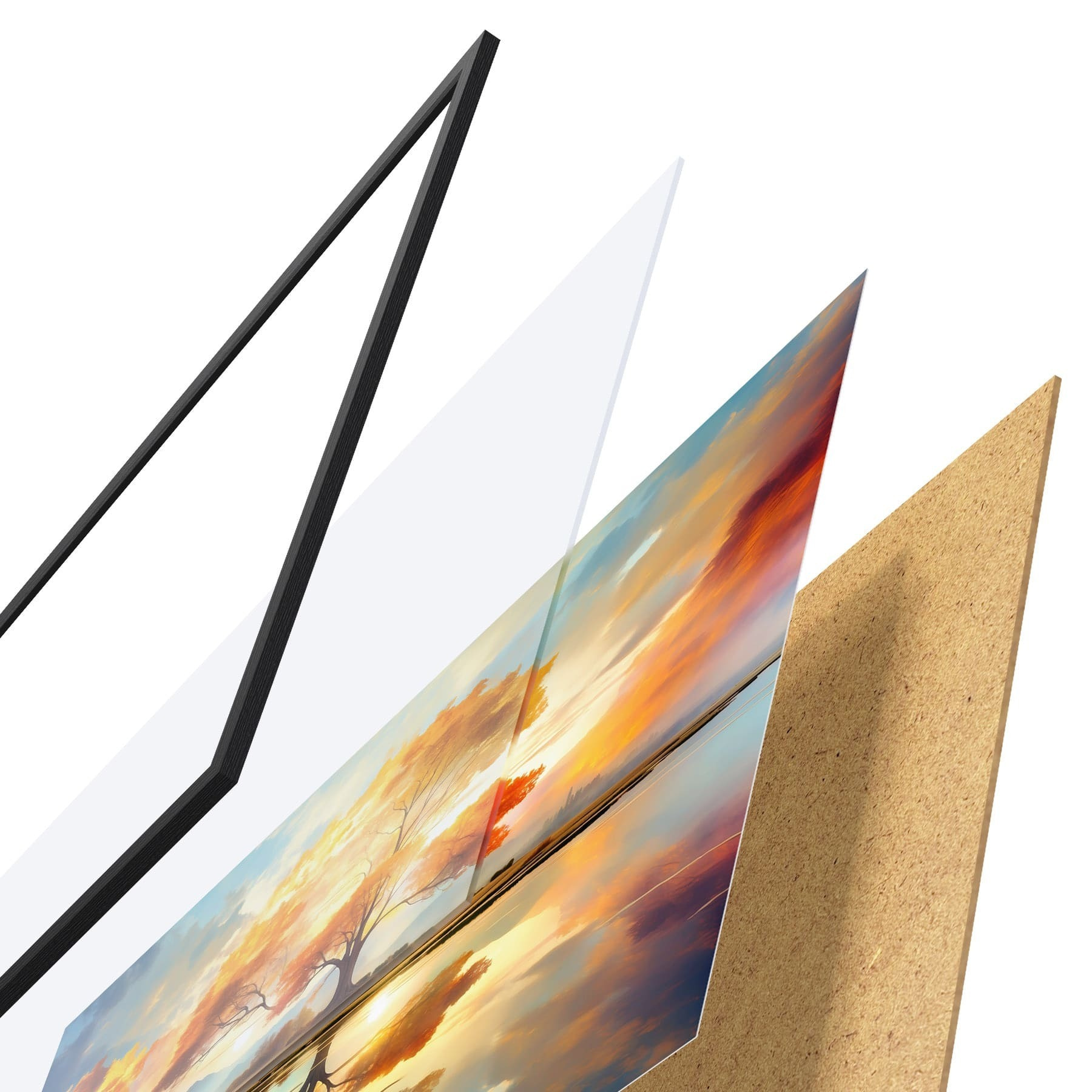 Das Poster besteht aus einem Rahmen, Plexiglas, einem gedruckten Bild und einer Rückwand aus Spanplatten. Dank der Halterungen auf der Rückseite kann das Poster sofort an die Wand gehängt werden.