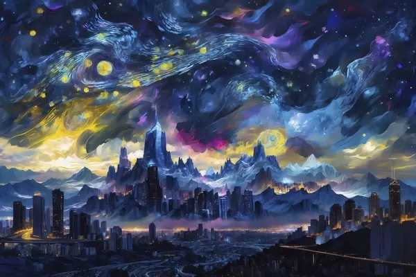 Poster Fantasie-Stadt unter einem leuchtenden Nachthimmel Nr f47288