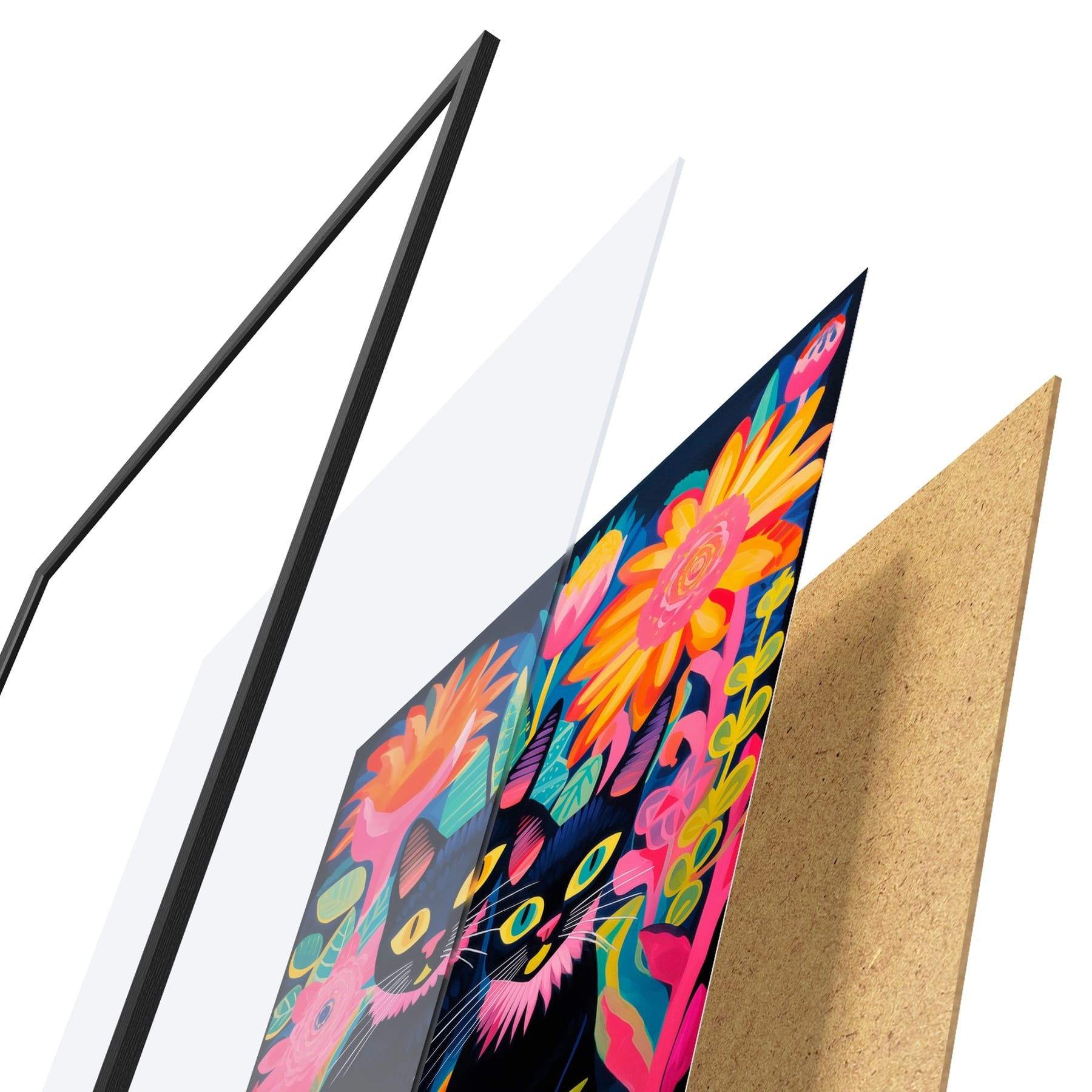 Poster Zwei schwarze Katzen zwischen bunten Blumen f47299