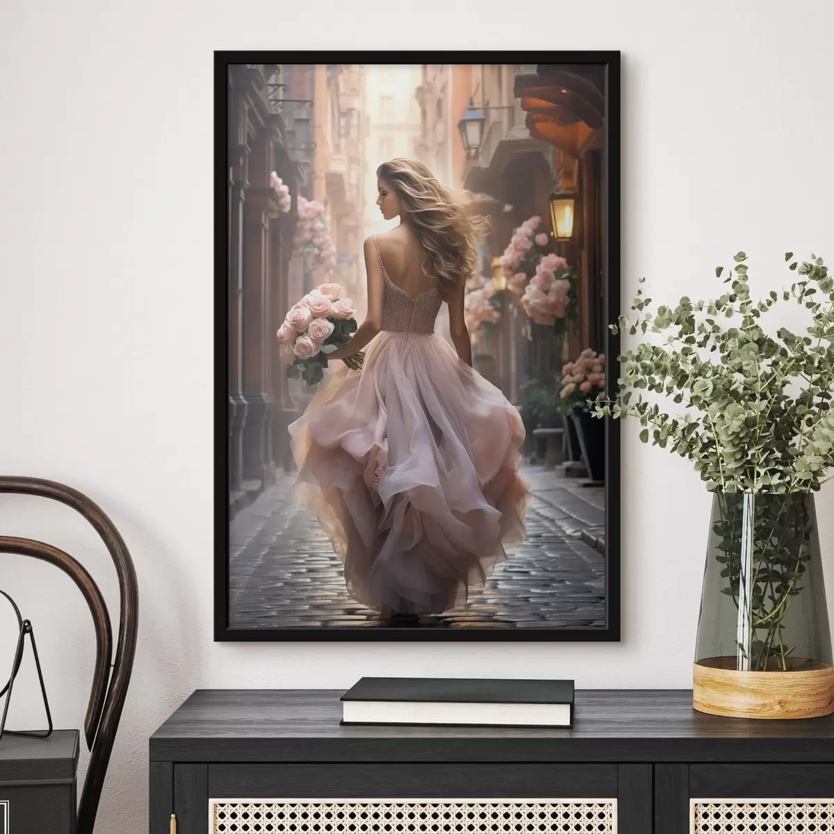 Poster Frau in einem rosa Kleid, die eine Straße entlanggeht Nr f47316