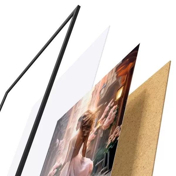 Das Poster besteht aus einem Rahmen, Plexiglas, einem gedruckten Bild und einer Rückwand aus Spanplatten. Dank der Halterungen auf der Rückseite kann das Poster sofort an die Wand gehängt werden.