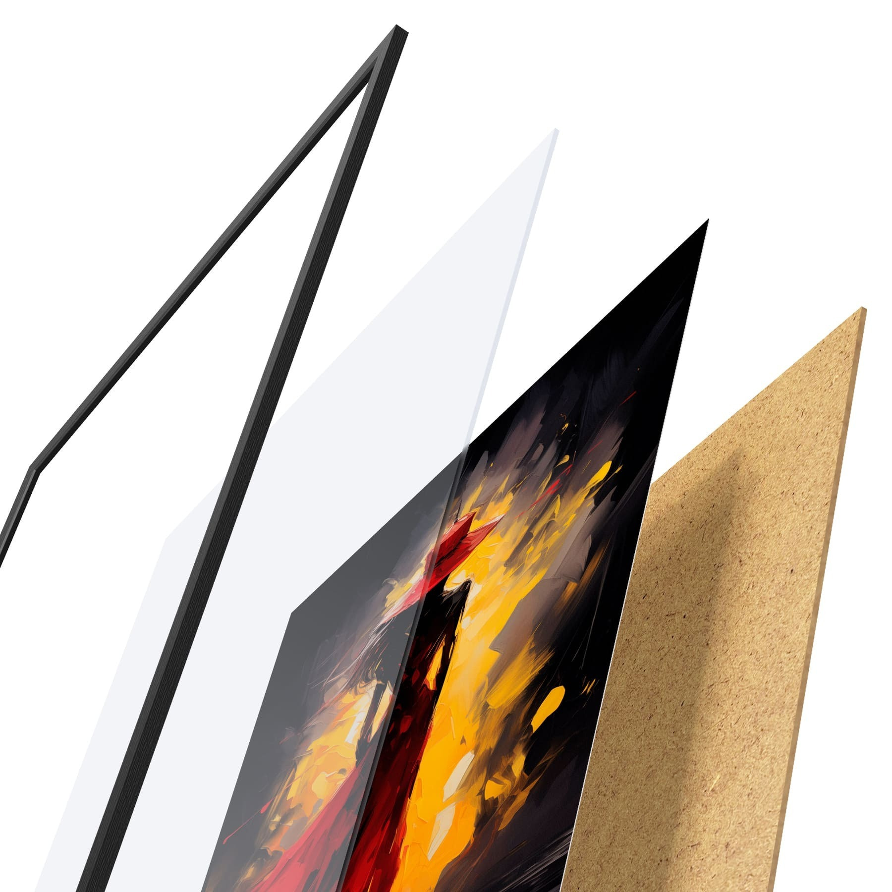 Das Poster besteht aus einem Rahmen, Plexiglas, einem gedruckten Bild und einer Rückwand aus Spanplatten. Dank der Halterungen auf der Rückseite kann das Poster sofort an die Wand gehängt werden.
