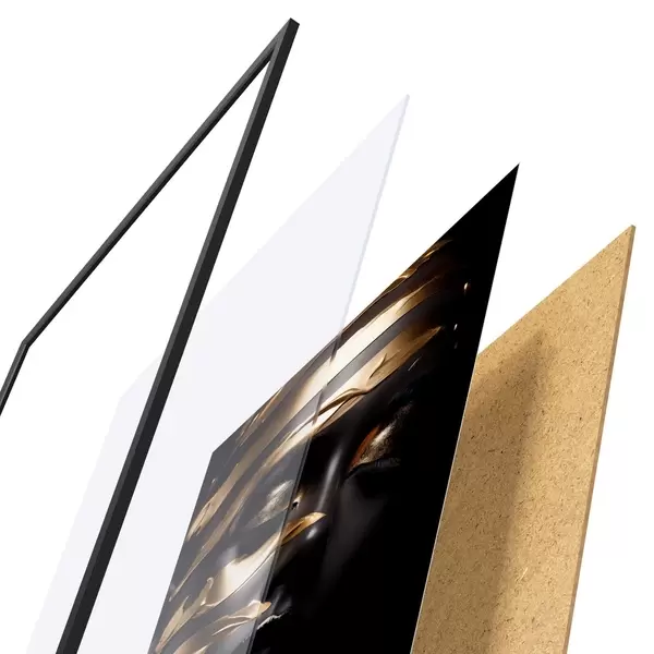Das Poster besteht aus einem Rahmen, Plexiglas, einem gedruckten Bild und einer Rückwand aus Spanplatten. Dank der Halterungen auf der Rückseite kann das Poster sofort an die Wand gehängt werden.