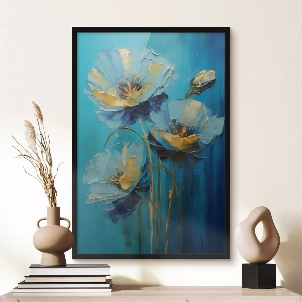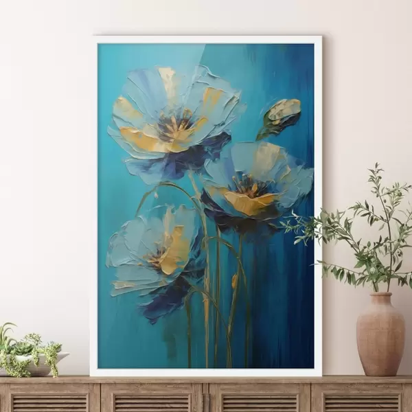 Poster Blaue Blumen auf einem lebhaften Hintergrund f47324