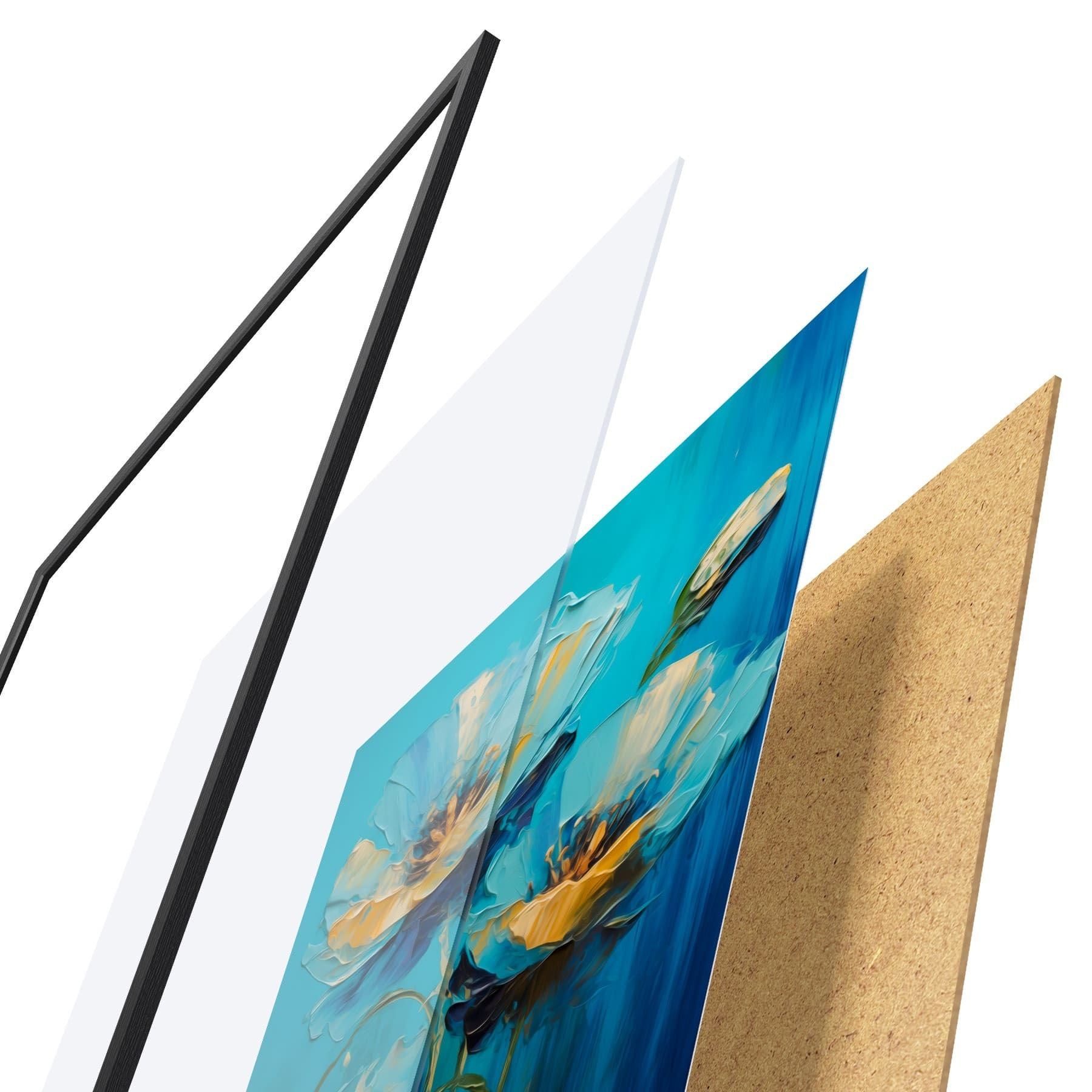 Das Poster besteht aus einem Rahmen, Plexiglas, einem gedruckten Bild und einer Rückwand aus Spanplatten. Dank der Halterungen auf der Rückseite kann das Poster sofort an die Wand gehängt werden.