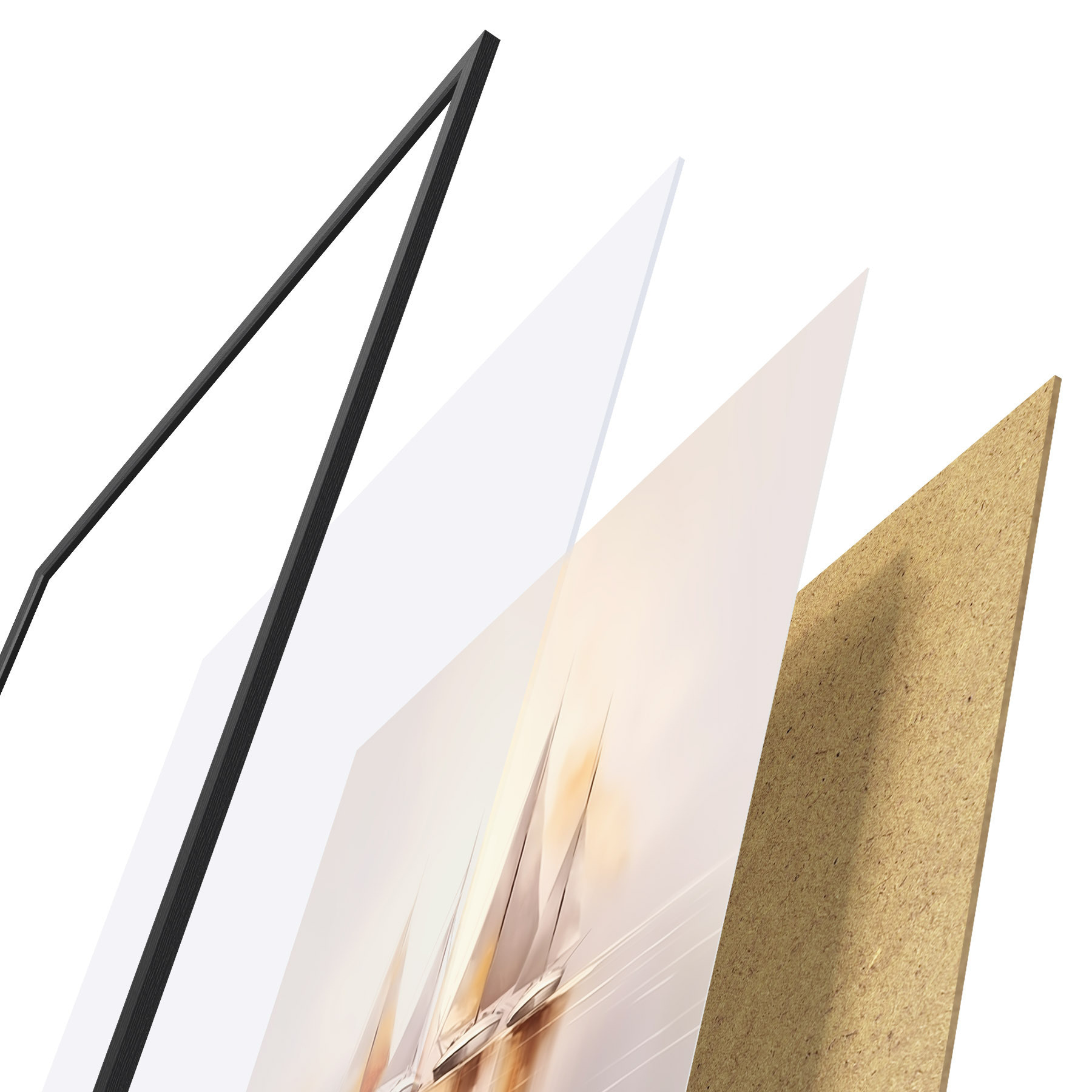 Das Poster besteht aus einem Rahmen, Plexiglas, einem gedruckten Bild und einer Rückwand aus Spanplatten. Dank der Halterungen auf der Rückseite kann das Poster sofort an die Wand gehängt werden.