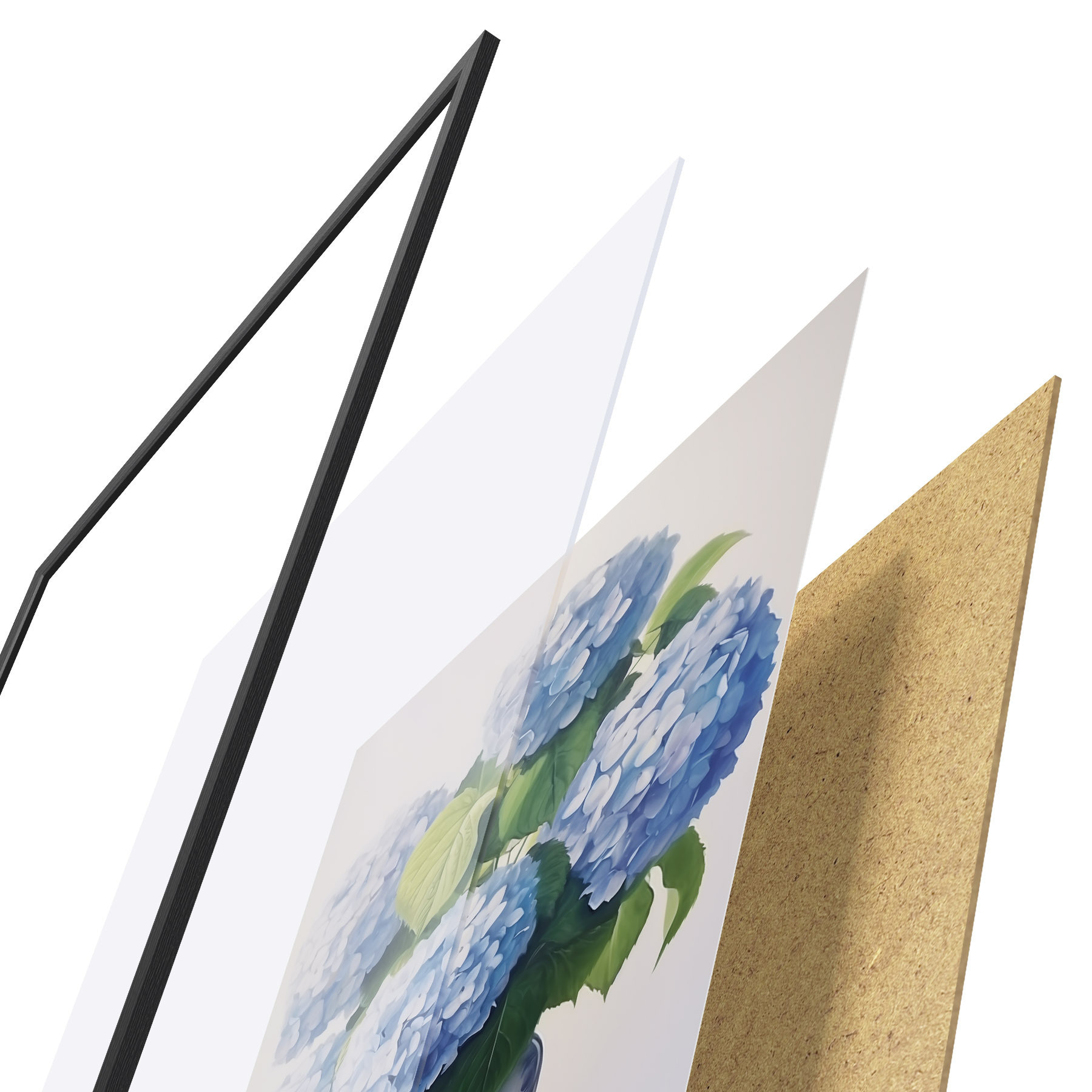 Das Poster besteht aus einem Rahmen, Plexiglas, einem gedruckten Bild und einer Rückwand aus Spanplatten. Dank der Halterungen auf der Rückseite kann das Poster sofort an die Wand gehängt werden.