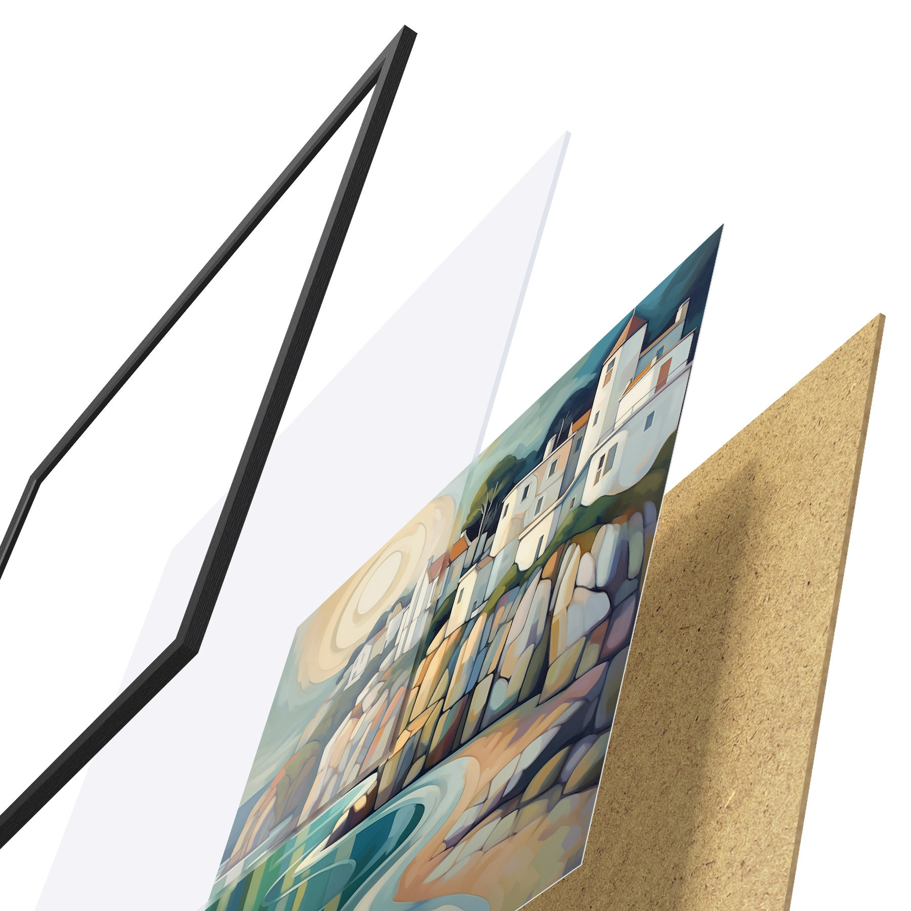 Das Poster besteht aus einem Rahmen, Plexiglas, einem gedruckten Bild und einer Rückwand aus Spanplatten. Dank der Halterungen auf der Rückseite kann das Poster sofort an die Wand gehängt werden.
