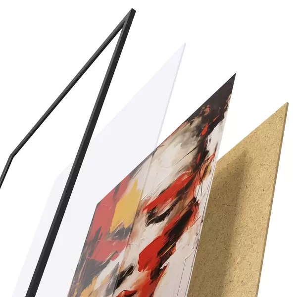 Das Poster besteht aus einem Rahmen, Plexiglas, einem gedruckten Bild und einer Rückwand aus Spanplatten. Dank der Halterungen auf der Rückseite kann das Poster sofort an die Wand gehängt werden.