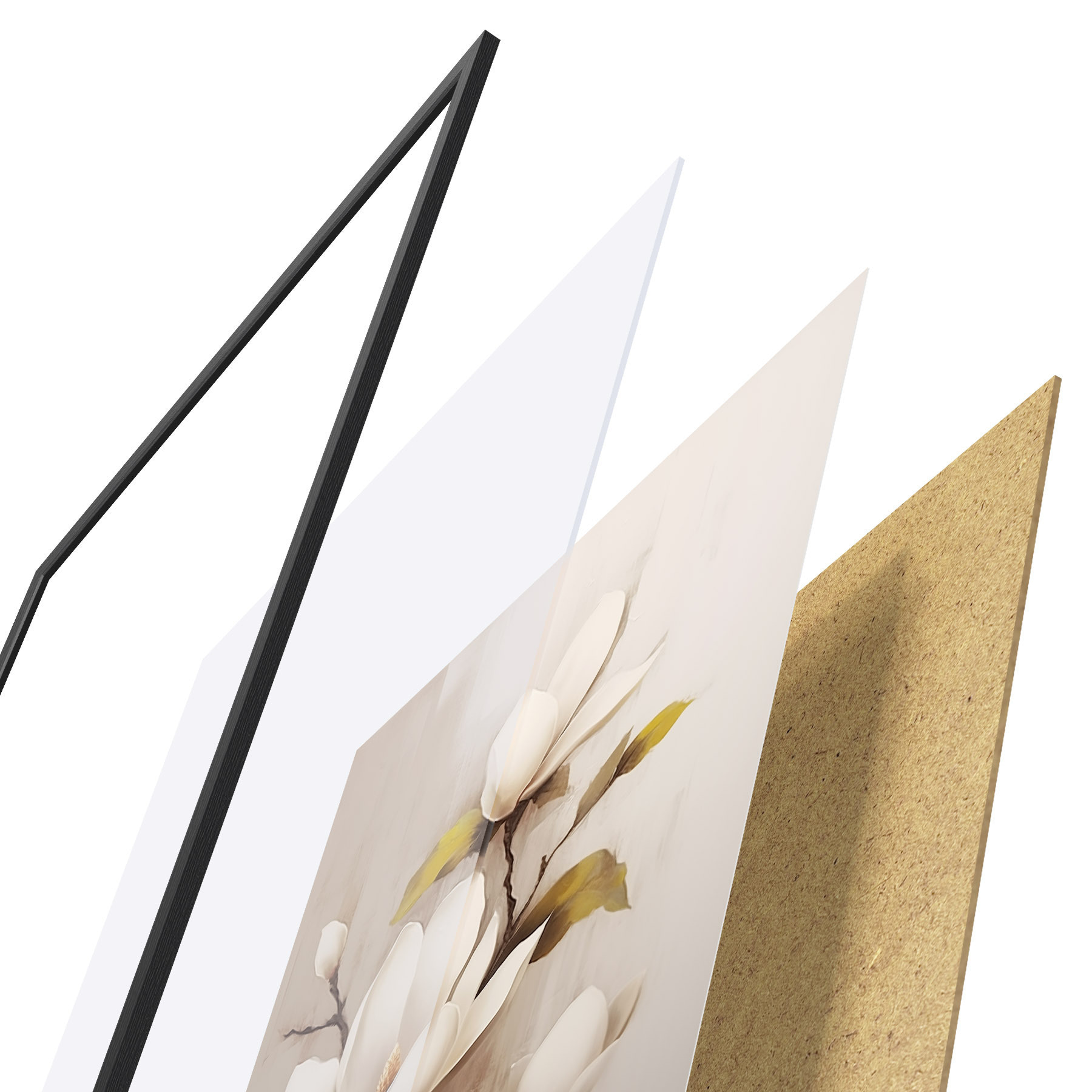Das Poster besteht aus einem Rahmen, Plexiglas, einem gedruckten Bild und einer Rückwand aus Spanplatten. Dank der Halterungen auf der Rückseite kann das Poster sofort an die Wand gehängt werden.