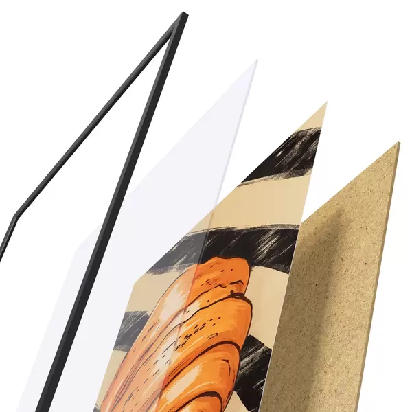 Das Poster besteht aus einem Rahmen, Plexiglas, einem gedruckten Bild und einer Rückwand aus Spanplatten. Dank der Halterungen auf der Rückseite kann das Poster sofort an die Wand gehängt werden.