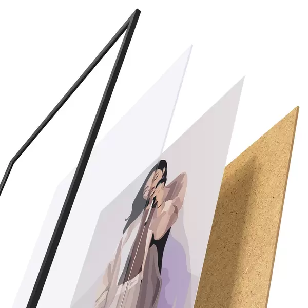 Das Poster besteht aus einem Rahmen, Plexiglas, einem gedruckten Bild und einer Rückwand aus Spanplatten. Dank der Halterungen auf der Rückseite kann das Poster sofort an die Wand gehängt werden.