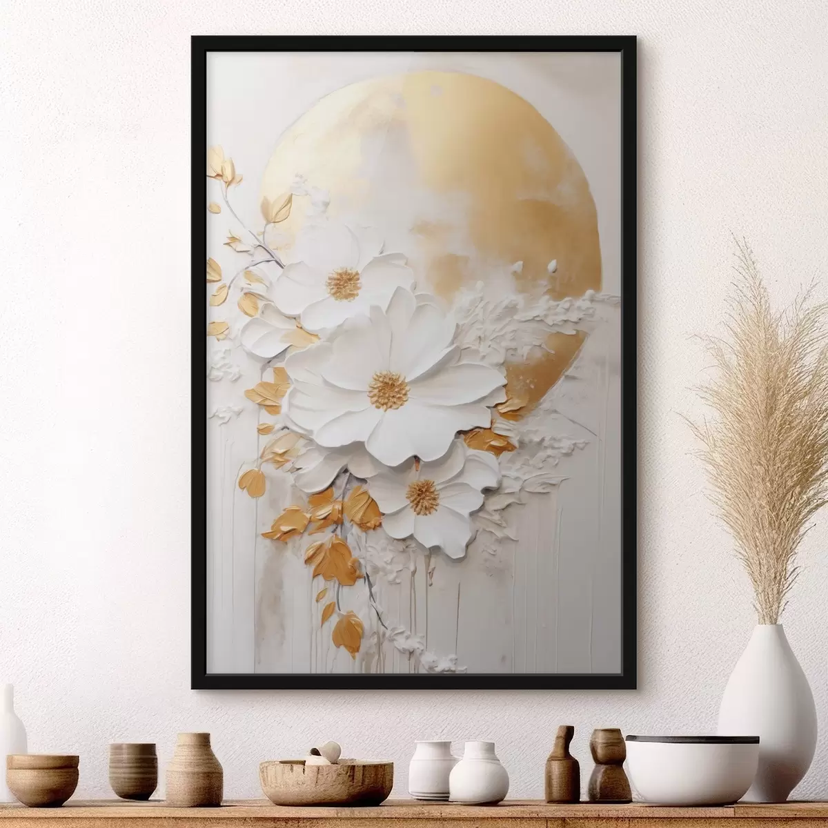 Poster Weiße Blumen mit gelben Akzenten und zarten Blättern vor einem strukturierten Hintergrund, moderne Kunst f47414