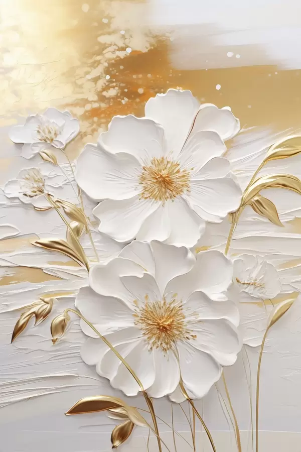 Poster Weiße Blumen mit gelben Akzenten und zarten Blättern vor einem strukturierten Hintergrund, moderne Kunst f47415