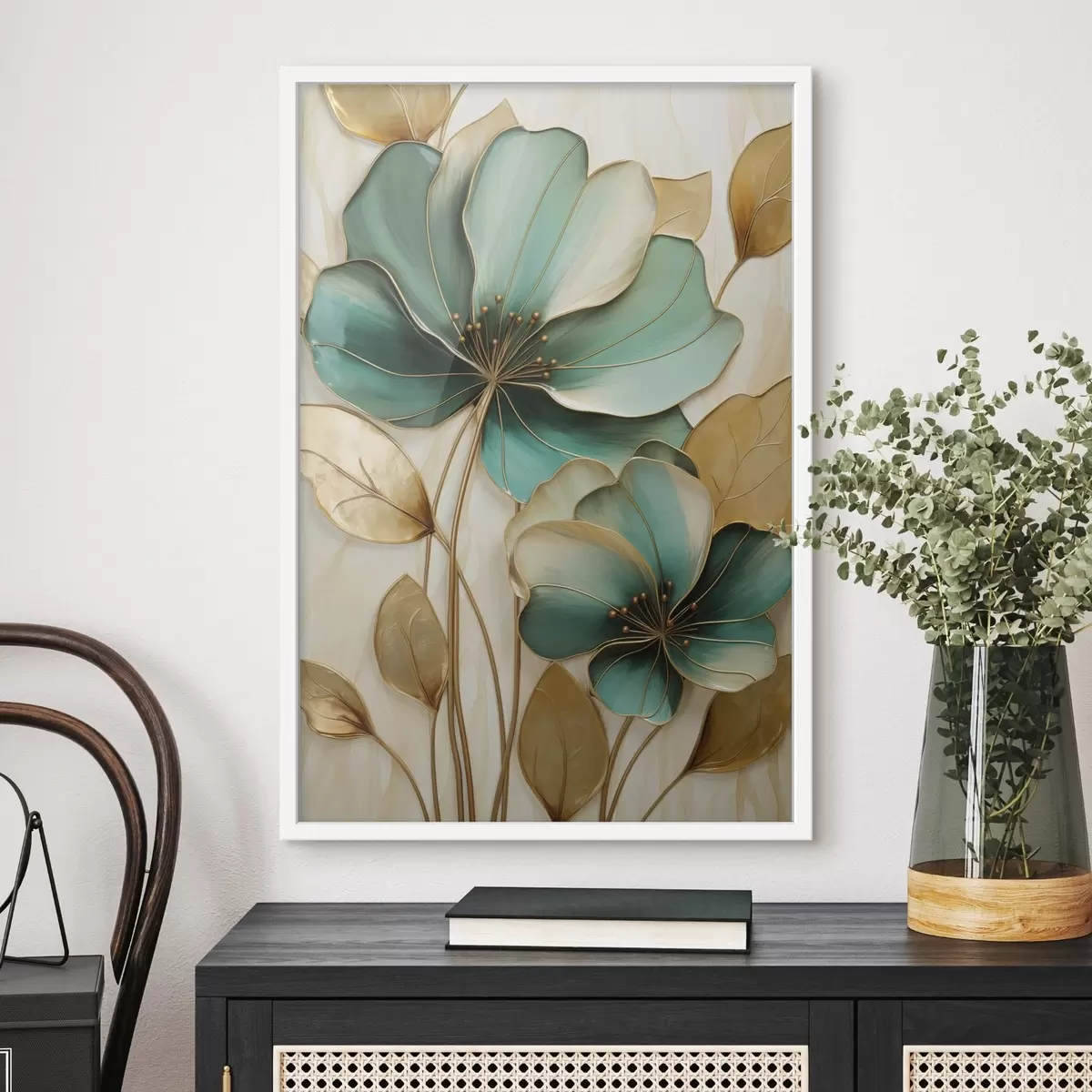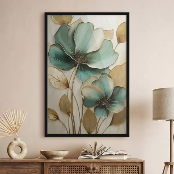 Poster Große blaugrüne und gelbe Blumen mit Konturen, umgeben von gelben Blättern vor abstraktem Hintergrund Nr f47418