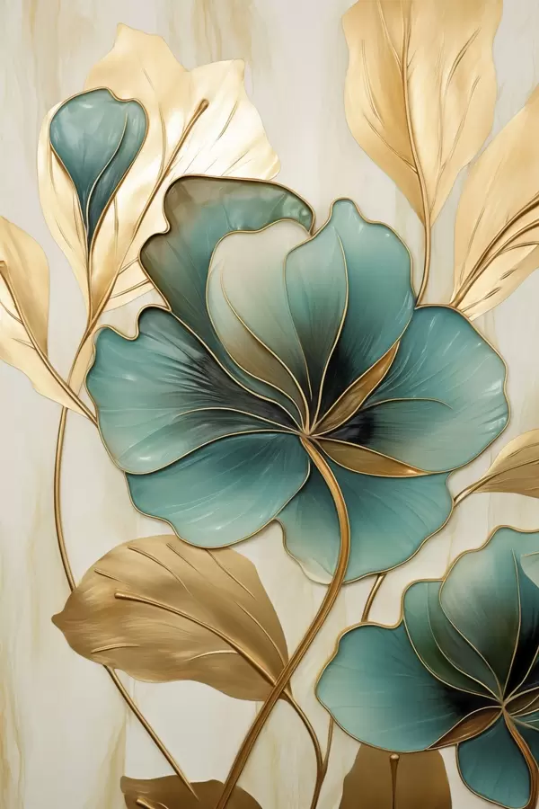 Poster Große blaugrüne und gelbe Blumen mit Konturen, umgeben von gelben Blättern vor abstraktem Hintergrund Nr f47419
